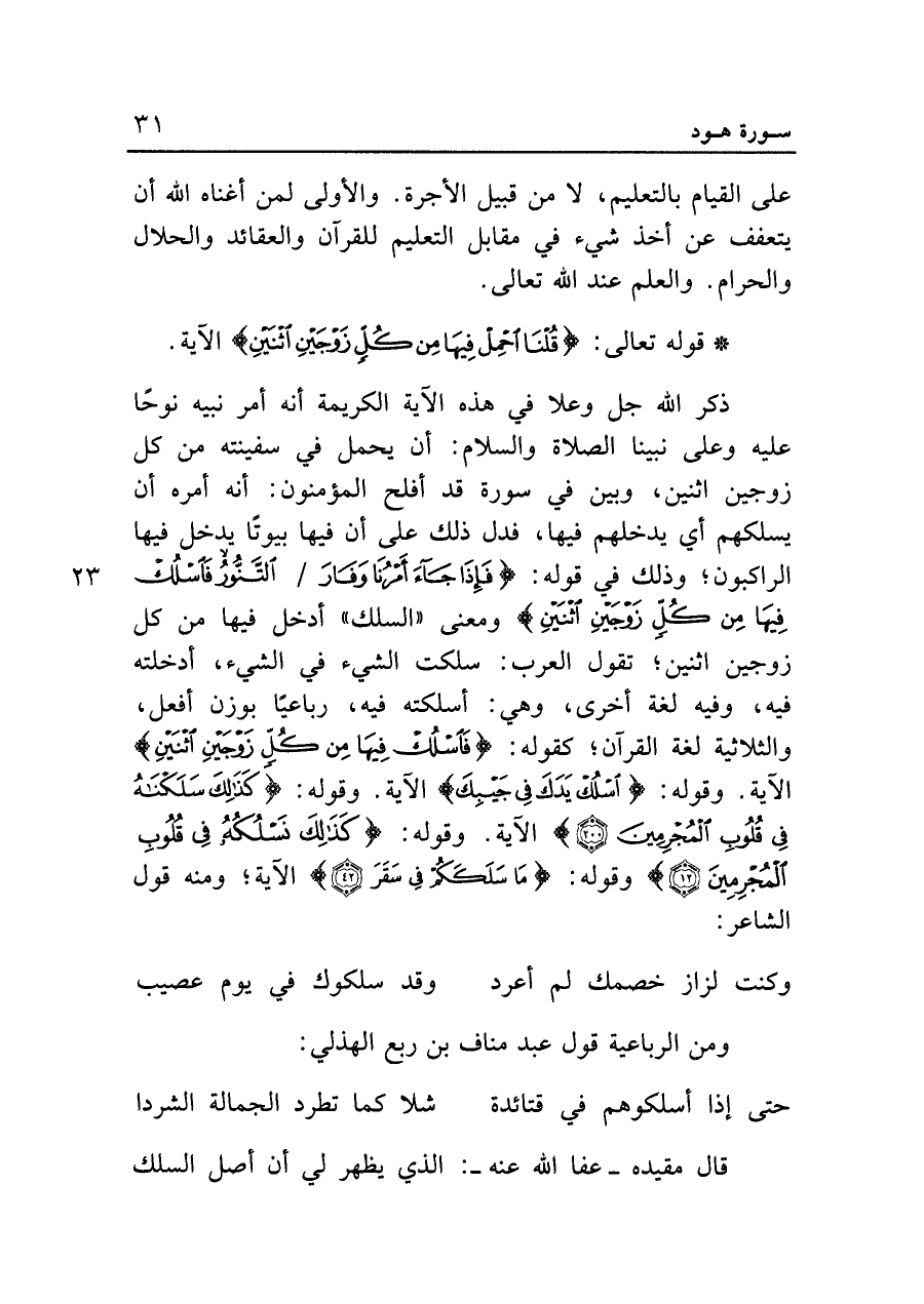 ذكر الله جل وعلا في هذه الآية الكريمة أنَّه أمر نبيه نوحًا عليه وعلى نبينا الصلاة والسلام: أن يحمل في سفينته من كل زوجين اثنين، وبين في سورة قد أفلح المؤمنون: أنَّه أمره أن يسلكهم أي يدخلهم فيها، فدل ذلك على أن فيها بيوتًا يدخل فيها الراكبون؛ وذلك في قوله: {فَإِذَا جَاءَ أَمْرُنَا وَفَارَ التَّنُّورُ فَاسْلُكْ فِيهَا مِنْ كُلٍّ زَوْجَيْنِ اثْنَيْنِ} ومعنى "السلك" أدخل فيها من كل زوجين اثنين؛ تقول العرب: سلكت الشيء في الشيء، أدخلته فيه، وفيه لغة أخرى، وهي: أسلكته فيه، رباعيًا بوزن أفعل، والثلاثية لغة القرآن؛ كقوله: {فَاسْلُكْ فِيهَا مِنْ كُلٍّ زَوْجَيْنِ اثْنَيْنِ} الآية. وقوله: {اسْلُكْ يَدَكَ فِى جَيْبِكَ} الآية. وقوله: {كَذَلِكَ سَلَكْنَاهُ فِى قُلُوبِ الْمُجْرِمِين (٢٠٠)} الآية. وقوله: {كَذلِكَ نَسْلُكُهُ فِى قُلُوبِ الْمُجْرِمِين (٢٠٠)} وقوله: {مَا سَلَكَكُمْ فِى سَقَرَ} الآية؛ ومنه قول الشاعر:
