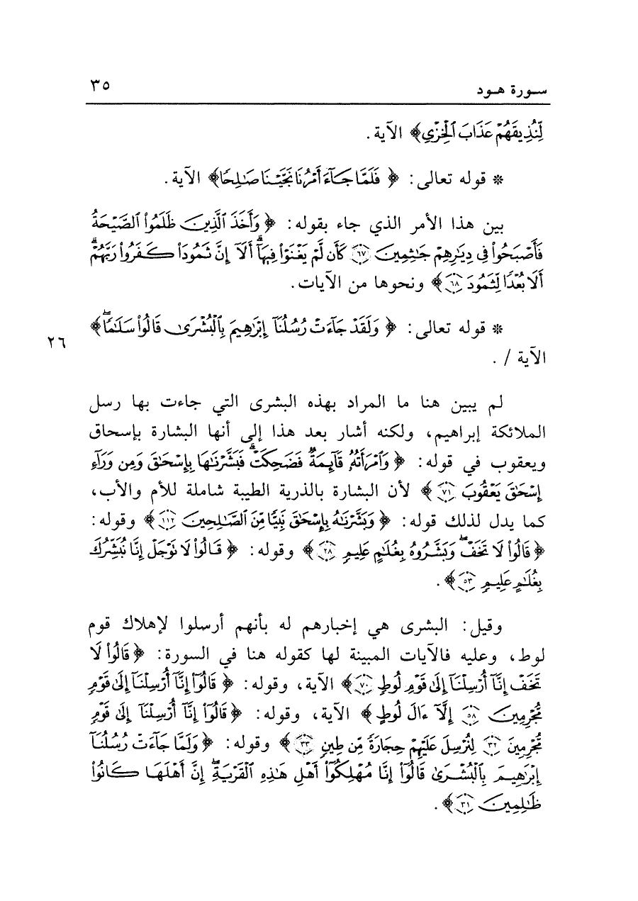 وقيل: البشرى هي إخبارهم له بأنهم أرسلوا لإهلاك قوم لوط، وعليه فالآيات المبينة لها كقوله هنا في السورة: {قَالُوا لَا تَخَفْ إِنَّا أُرْسِلْنَا إِلَى قَوْمِ لُوطٍ (٧٠)} الآية، وقوله: {قَالُوا إِنَّا أُرْسِلْنَا إِلَى قَوْمٍ مُجْرِمِينَ (٥٨) إِلَّا آلَ لُوطٍ} الآية، وقوله: {قَالُوا إِنَّا أُرْسِلْنَا إِلَى قَوْمٍ مُجْرِمِينَ (٣٢) لِنُرْسِلَ عَلَيْهِمْ حِجَارَةً مِنْ طِينٍ} الآية، وقوله: {وَلَمَّا جَاءَتْ رُسُلُنَا إِبْرَاهِيمَ بِالْبُشْرَى قَالُوا إِنَّا مُهْلِكُو أَهْلِ هَذِهِ الْقَرْيَةِ إِنَّ أَهْلَهَا كَانُوا ظَالِمِينَ (٣١)}.