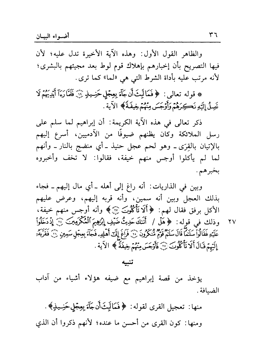 وبين في الذاريات: أنَّه راغ إلى أهله -أي مال إليهم- فجاء بذلك العجل وبين أنَّه سمين، وأنه قربه إليهم، وعرض عليهم الأكل برفق فقال لهم: {قَالَ أَلَا تَأْكُلُونَ (٢٧)} وأنه أوجس منهم خيفة، وذلك في قوله: {هَلْ أَتَاكَ حَدِيثُ ضَيْفِ إِبْرَاهِيمَ الْمُكْرَمِينَ (٢٤) إِذْ دَخَلُوا عَلَيْهِ فَقَالُوا سَلَامًا قَالَ سَلَامٌ قَوْمٌ مُنْكَرُونَ (٢٥) فَرَاغَ إِلَى أَهْلِهِ فَجَاءَ بِعِجْلٍ سَمِينٍ (٢٦) فَقَرَّبَهُ إِلَيْهِمْ {قَالَ أَلَا تَأْكُلُونَ (٢٧) فَأَوْجَسَ مِنْهُمْ خِيفَةً} الآية.