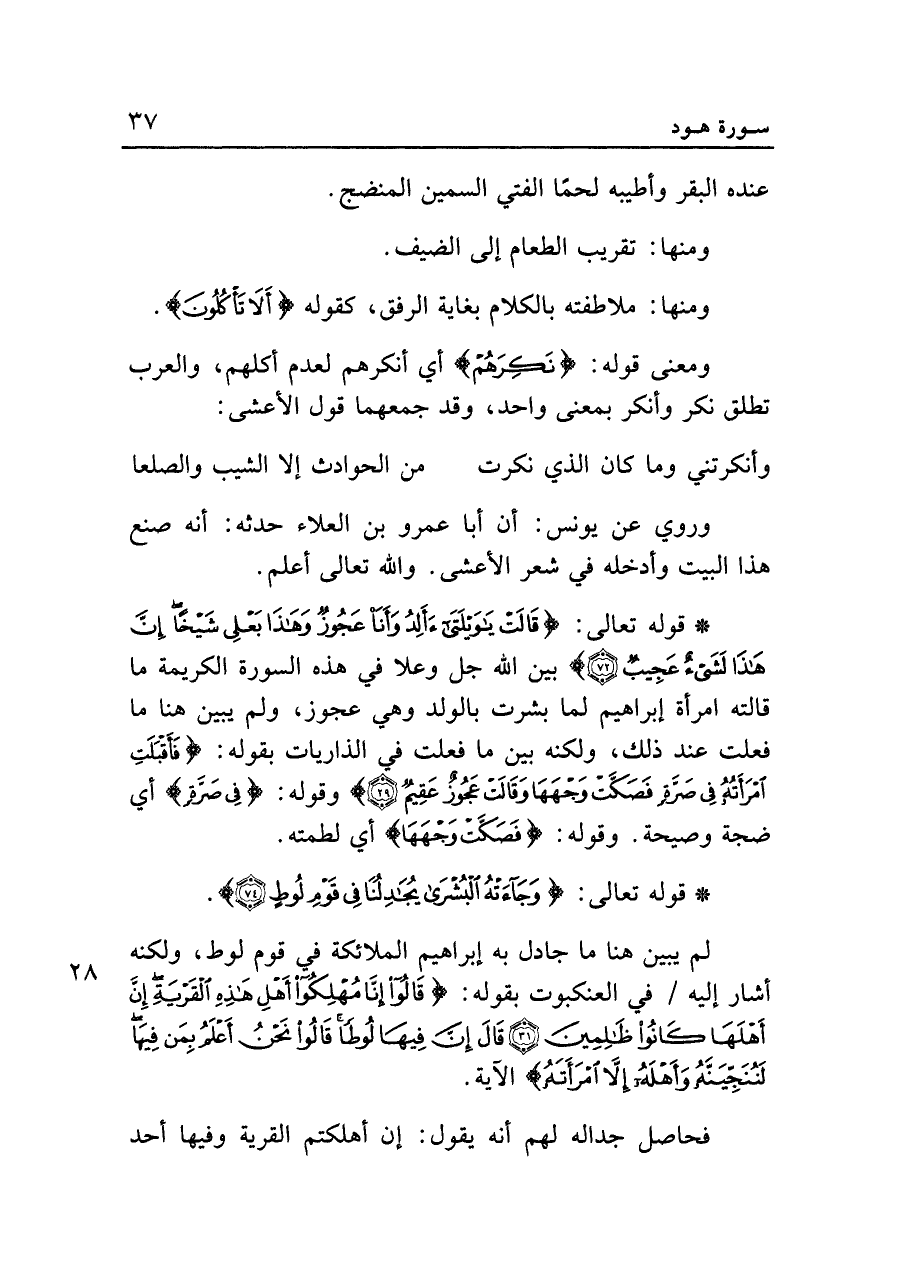 • قوله تعالى: {قَالَتْ يَاوَيْلَتَى أَأَلِدُ وَأَنَا عَجُوزٌ وَهَذَا بَعْلِي شَيْخًا إِنَّ هَذَا لَشَيْءٌ عَجِيبٌ (٧٢)} بين الله جل وعلا في هذه السورة الكريمة ما قالته امرأة إبراهيم لما بشرت بالولد وهي عجوز، ولم يبين هنا ما فعلت عند ذلك، ولكنه بين ما فعلت في الذاريات بقوله: {فَأَقْبَلَتِ امْرَأَتُهُ فِي صَرَّةٍ فَصَكَّتْ وَجْهَهَا وَقَالَتْ عَجُوزٌ عَقِيمٌ (٢٩)} وقوله: {فِى صَرَّةٍ} أي ضجة وصيحة. وقوله: {فَصَكَّتْ وَجْهَهَا} أي لطمته.