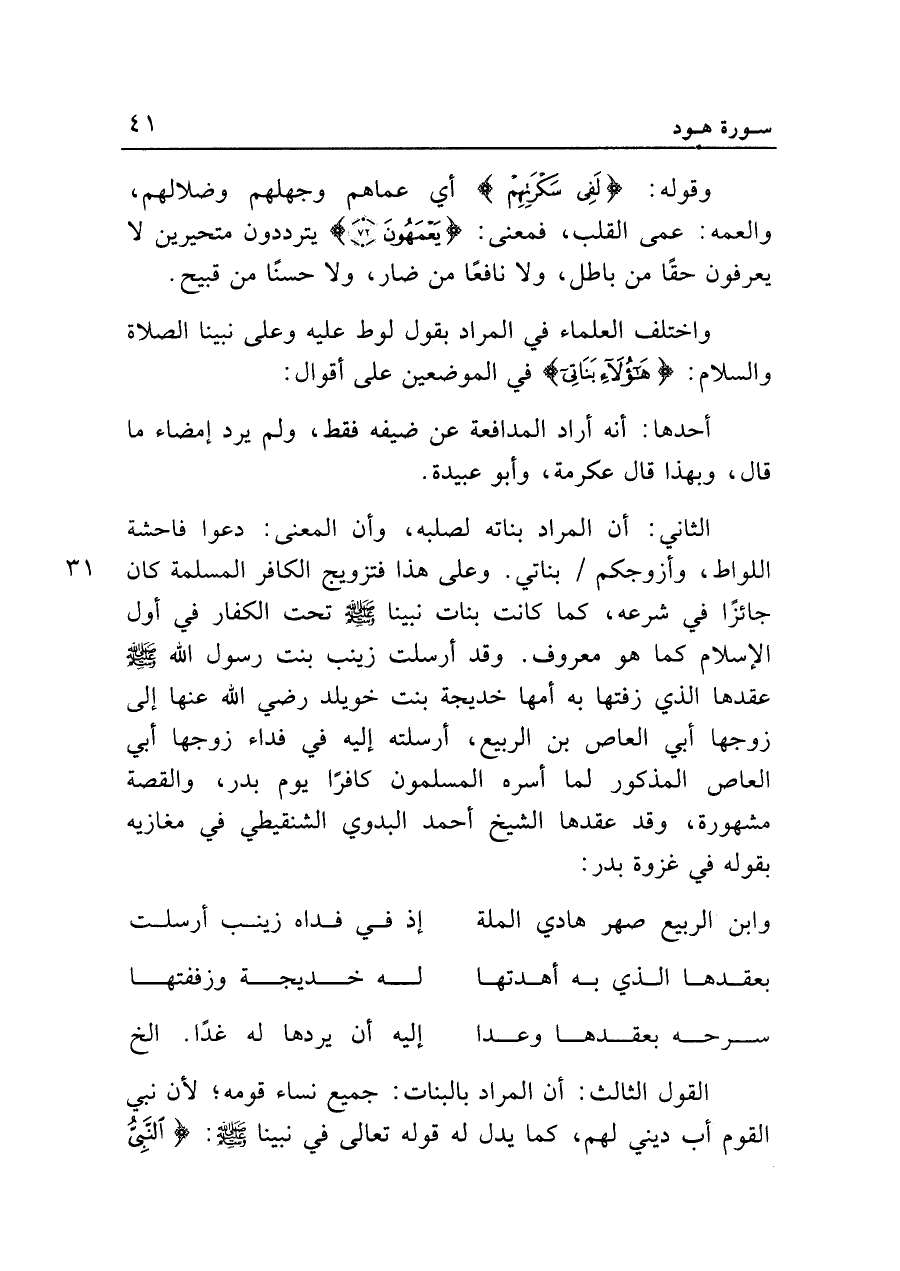 الثاني: أن المراد بناته لصلبه، وأن المعنى: دعوا فاحشة اللواط، وأزوجكم بناتي. وعلى هذا فتزويج الكافر المسلمة كان جائزًا في شرعه، كما كانت بنات نبينا - صلى الله عليه وسلم - تحت الكفار في أول الإسلام كما هو معروف. وقد أرسلت زينب بنت رسول الله - صلى الله عليه وسلم - عقدها الذي زفتها به أمها خديجة بنت خويلد رضي الله عنها إلى زوجها أبي العاص بنُ الربيع، أرسلته إليه في فداء زوجها أبي العاص المذكور لما أسره المسلمون كافرًا يوم بدر، والقصة مشهورة، وقد عقدها الشيخ أحمد البدوي الشنقيطي في مغازيه بقوله في غزوة بدر: