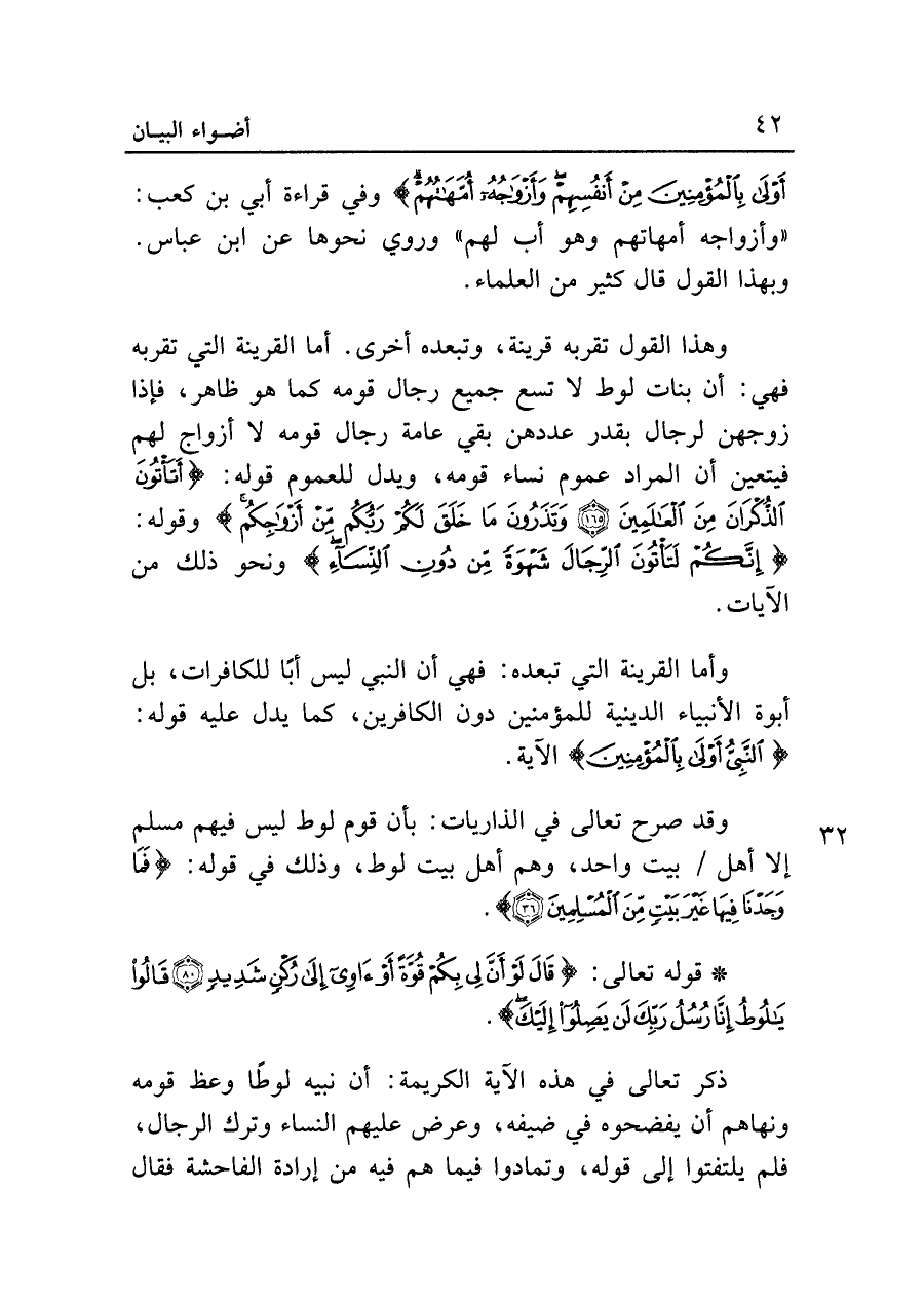 وهذا القول تقربه قرينة، وتبعده أخرى. أما القرينة التي تقربه فهي: أن بنات لوط لا تسع جميع رجال قومه كما هو ظاهر، فإذا زوجهن لرجال بقدر عددهن بقي عامة رجال قومه لا أزواج لهم فيتعين أن المراد عموم نساء قومه، ويدل للعموم قوله: {أَتَأْتُونَ الذُّكْرَانَ مِنَ الْعَالمِينَ (١٦٥) وَتَذَرُونَ مَا خَلَقَ لَكُمْ رَبُّكُمْ مِنْ أَزْوَاجِكُمْ} وقوله: {إِنَّكُمْ لَتَأْتُونَ الرِّجَالَ شَهْوَةً مِنْ دُونِ النِّسَاءِ} ونحو ذلك من الآيات.