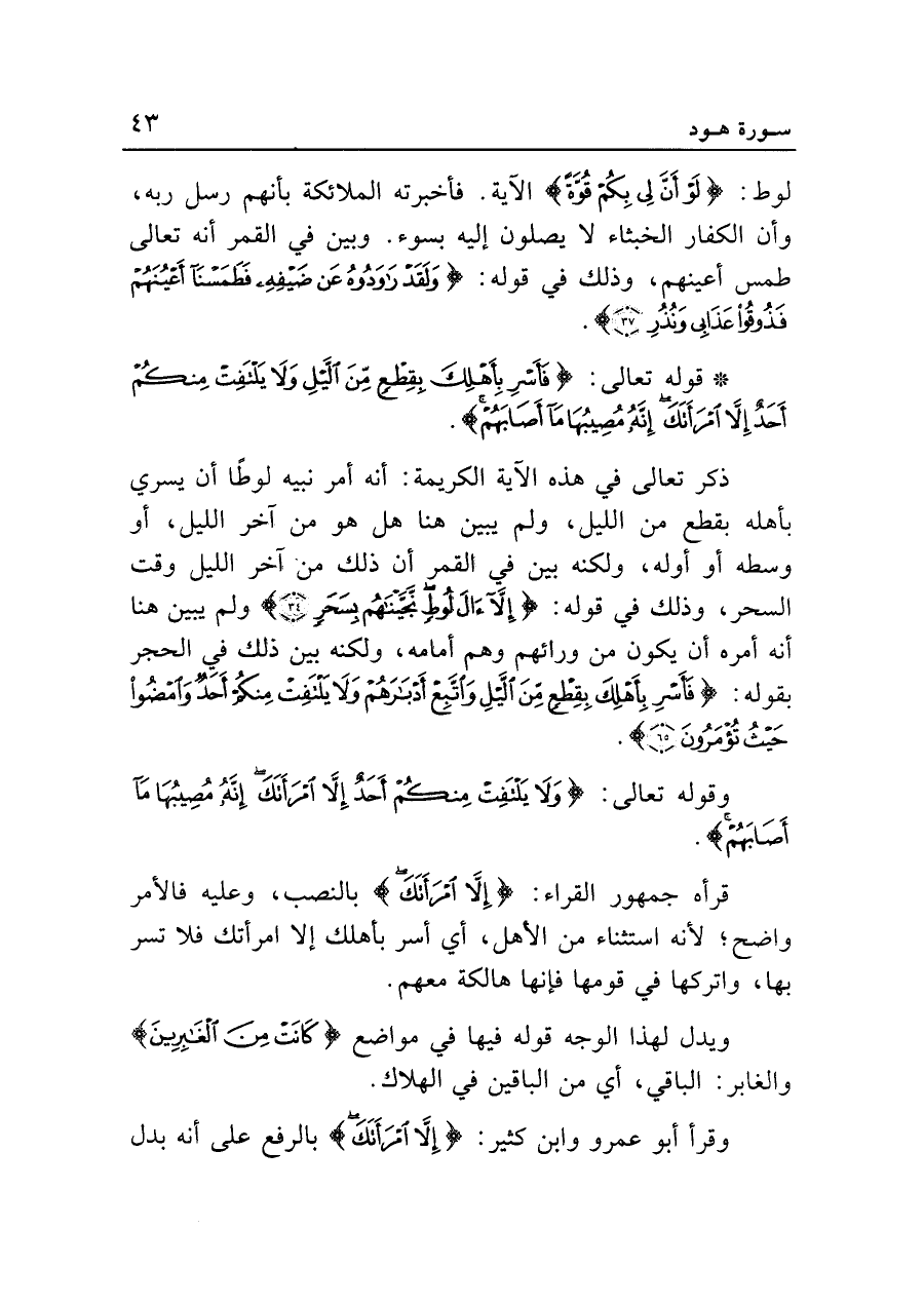ذكر تعالى في هذه الآية الكريمة: أنَّه أمر نبيه لوطًا أن يسري بأهله بقطع من الليل، ولم يبين هنا هل هو من آخر الليل، أو وسطه أو أوله، ولكنه بين في القمر أن ذلك من آخر الليل وقت السحر، وذلك في قوله: {إِلَّا آلَ لُوطٍ نَجَّيْنَاهُمْ بِسَحَرٍ (٣٤)} ولم يبين هنا أنَّه أمره أن يكون من ورائهم وهم أمامه، ولكنه بين ذلك في الحجر بقوله: {فَأَسْرِ بِأَهْلِكَ بِقِطْعٍ مِنَ اللَّيْلِ وَاتَّبِعْ أَدْبَارَهُمْ وَلَا يَلْتَفِتْ مِنْكُمْ أَحَدٌ وَامْضُوا حَيْثُ تُؤْمَرُونَ (٦٥)}.