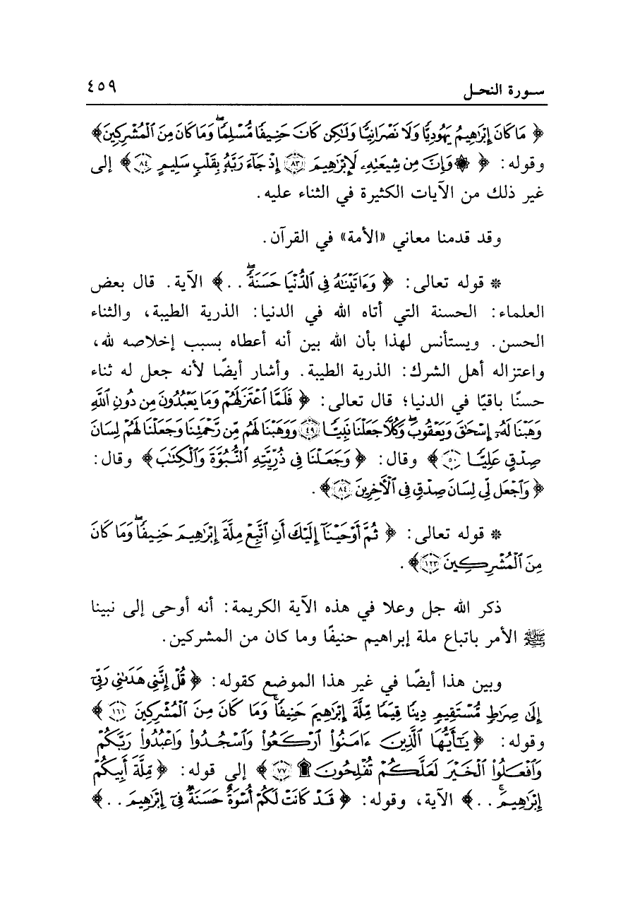 وبين هذا أيضًا في غير هذا الموضع كقوله: {قُلْ إِنَّنِي هَدَانِي رَبِّي إِلَى صِرَاطٍ مُسْتَقِيمٍ دِينًا قِيَمًا مِلَّةَ إِبْرَاهِيمَ حَنِيفًا وَمَا كَانَ مِنَ الْمُشْرِكِينَ (١٦١)} وقوله: {يَاأَيُّهَا الَّذِينَ آمَنُوا ارْكَعُوا وَاسْجُدُوا وَاعْبُدُوا رَبَّكُمْ وَافْعَلُوا الْخَيْرَ لَعَلَّكُمْ تُفْلِحُونَ (٧٧)} إلى قوله: {مِلَّةَ أَبِيكُمْ إِبْرَاهِيمَ} الآية، وقوله: {قَدْ كَانَتْ لَكُمْ أُسْوَةٌ حَسَنَةٌ فِي إِبْرَاهِيمَ .. }