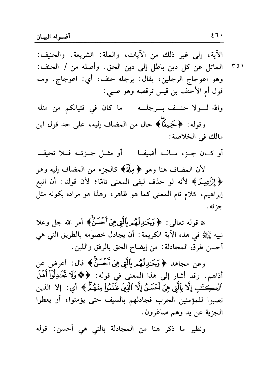 الآية، إلى غير ذلك من الآيات، والملة: الشريعة. والحنيف: المائل عن كل دين باطل إلى دين الحق. وأصله من الحنف: وهو اعوجاج الرجلين، يقال: برجله حنف، أي: اعوجاج. ومنه قول أم الأحنف بن قيس ترقصه وهو صبي:
