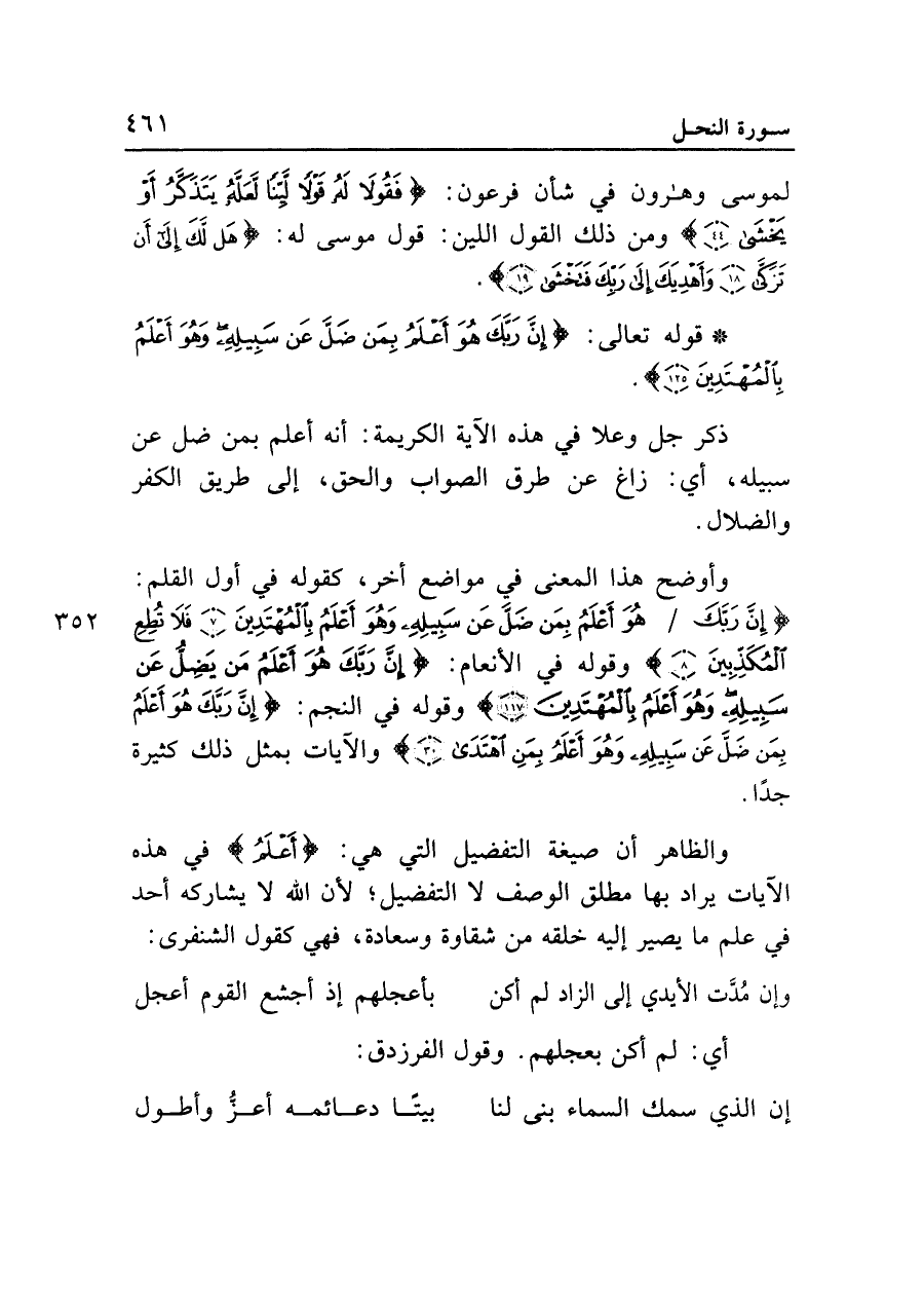 وأوضح هذا المعنى في مواضع أخر، كقوله في أول القلم: {إِنَّ رَبَّكَ هُوَ أَعْلَمُ بِمَنْ ضَلَّ عَنْ سَبِيلِهِ وَهُوَ أَعْلَمُ بِالْمُهْتَدِينَ (٧) فَلَا تُطِعِ الْمُكَذِّبِينَ (٨)} وقوله في الأنعام: {إِنَّ رَبَّكَ هُوَ أَعْلَمُ مَنْ يَضِلُّ عَنْ سَبِيلِهِ وَهُوَ أَعْلَمُ بِالْمُهْتَدِينَ (١١٧)} وقوله في النجم: {إِنَّ رَبَّكَ هُوَ أَعْلَمُ بِمَنْ ضَلَّ عَنْ سَبِيلِهِ وَهُوَ أَعْلَمُ بِمَنِ اهْتَدَى (٣٠)} والآيات بمثل ذلك كثيرة جدًا.