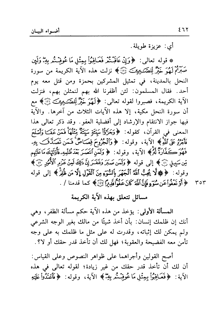 • قوله تعالى: {وَإِنْ عَاقَبْتُمْ فَعَاقِبُوا بِمِثْلِ مَا عُوقِبْتُمْ بِهِ وَلَئِنْ صَبَرْتُمْ لَهُوَ خَيْرٌ لِلصَّابِرِينَ (١٢٦)} نزلت هذه الآية الكريمة من سورة النحل بالمدينة، في تمثيل المشركين بحمزة ومن قتل معه يوم أحد. فقال المسلمون: لئن أظفرنا الله بهم لنمثلن بهم، فنزلت الآية الكريمة، فصبروا لقوله تعالى: {لَهُوَ خَيْرٌ لِلصَّابِرِينَ (١٢٦)} أن سورة النحل مكية، إلا هذه الآيات الثلاث من آخرها. والآية فيها جواز الانتقام والإرشاد إلى أفضلية العفو. وقد ذكر تعالى هذا المعنى في القرآن، كقوله: {وَجَزَاءُ سَيِّئَةٍ سَيِّئَةٌ مِثْلُهَا فَمَنْ عَفَا وَأَصْلَحَ فَأَجْرُهُ عَلَى اللَّهِ} الآية، وقوله: {وَالْجُرُوحَ قِصَاصٌ فَمَنْ تَصَدَّقَ بِهِ فَهُوَ كَفَّارَةٌ لَهُ} الآية، وقوله: {وَلَمَنِ انْتَصَرَ بَعْدَ ظُلْمِهِ فَأُولَئِكَ مَا عَلَيْهِمْ مِنْ سَبِيلٍ (٤١)} إلى قوله {وَلَمَنْ صَبَرَ وَغَفَرَ إِنَّ ذَلِكَ لَمِنْ عَزْمِ الْأُمُورِ (٤٣)} وقوله: {لَا يُحِبُّ اللَّهُ الْجَهْرَ بِالسُّوءِ مِنَ الْقَوْلِ إِلَّا مَنْ ظُلِمَ} إلى قوله {أَوْ تَعْفُوا عَنْ سُوءٍ فَإِنَّ اللَّهَ كَانَ عَفُوًّا قَدِيرًا (١٤٩)} كما قدمنا.