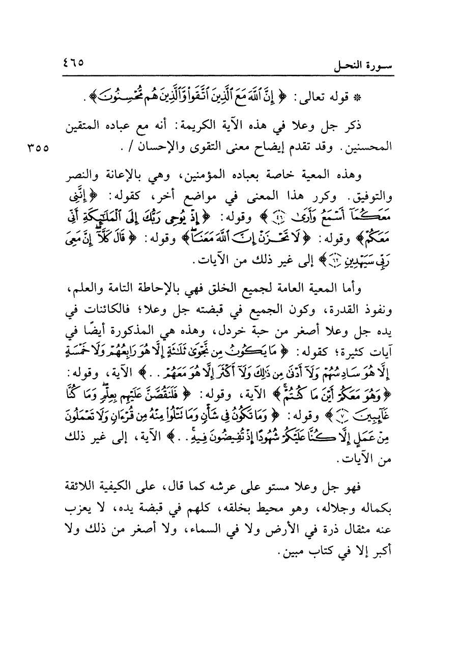 • قوله تعالى: {إِنَّ اللَّهَ مَعَ الَّذِينَ اتَّقَوْا وَالَّذِينَ هُمْ مُحْسِنُونَ (١٢٨)}.