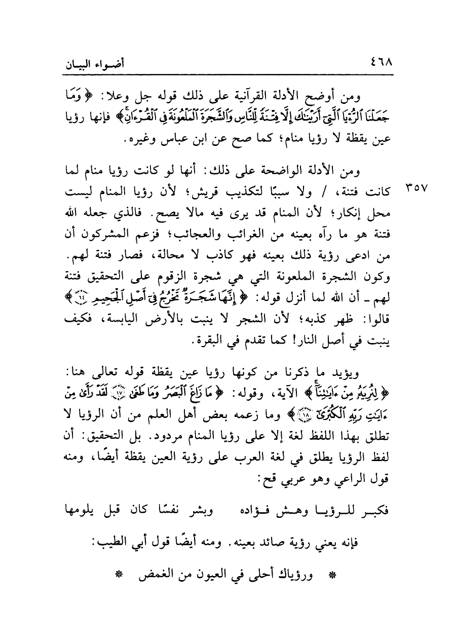 ومن أوضح الأدلة القرآنية على ذلك قوله جل وعلا: {وَمَا جَعَلْنَا الرُّؤْيَا الَّتِي أَرَيْنَاكَ إِلَّا فِتْنَةً لِلنَّاسِ وَالشَّجَرَةَ الْمَلْعُونَةَ فِي الْقُرْآنِ} فإنها رؤيا عين يقظة لا رؤيا منام؛ كما صح عن ابن عباس وغيره.