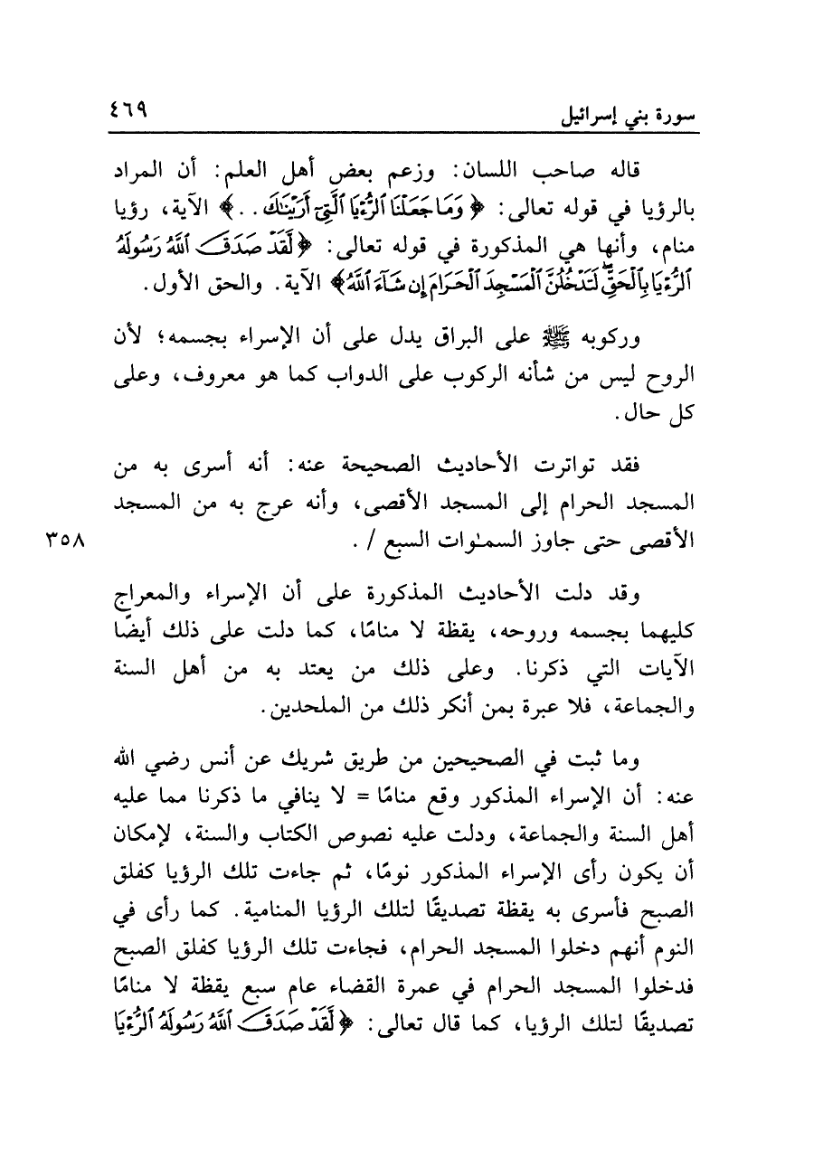 قاله صاحب اللسان: وزعم بعض أهل العلم: أن المراد بالرؤيا في قوله تعالى: {وَمَا جَعَلْنَا الرُّؤْيَا الَّتِي أَرَيْنَاكَ ... } الآية، رؤيا منام، وأنها هي المذكورة في قوله تعالى: {لَقَدْ صَدَقَ اللَّهُ رَسُولَهُ الرُّؤْيَا بِالْحَقِّ لَتَدْخُلُنَّ الْمَسْجِدَ الْحَرَامَ إِنْ شَاءَ اللَّهُ} الآية. والحق الأول.