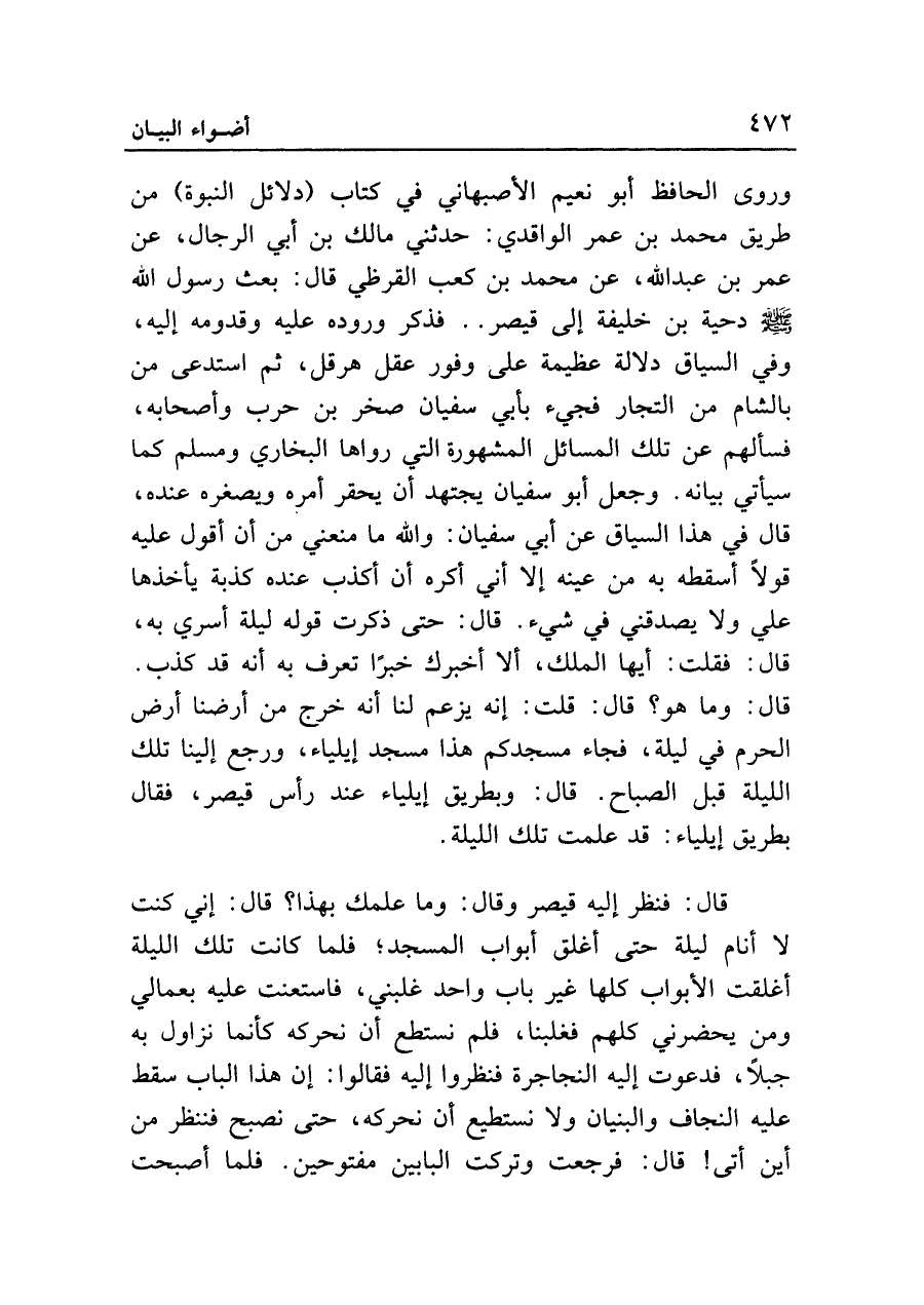 وروى الحافظ أبو نعيم الأصبهاني في كتاب (دلائل النبوة) من طريق محمد بن عمر الواقدي: حدثني مالك بن أبي الرجال، عن عمر بن عبد الله، عن محمد بن كعب القرظي قال: بعث رسول الله - صلى الله عليه وسلم - دحية بن خليفة إلى قيصر .. فذكر وروده عليه وقدومه إليه، وفي السياق دلالة عظيمة على وفور عقل هرقل، ثم استدعى من بالشام من التجار فجيء بأبي سفيان صخر بن حرب وأصحابه، فسألهم عن تلك المسائل المشهورة التي رواها البخاري ومسلم كما سيأتي بيانه. وجعل أبو سفيان يجتهد أن يحقر أمره ويصغره عنده، قال في هذا السياق عن أبي سفيان: والله ما منعني من أن أقول عليه قولًا أسقطه به من عينه إلا أني أكره أن أكذب عنده كذبة يأخذها على ولا يصدقني في شيء. قال: حتى ذكرت قوله ليلة أسري به، قال: فقلت: أيها الملك، ألا أخبرك خبرًا تعرف به أنه قد كذب. قال: وما هو؟ قال: قلت: إنه يزعم لنا أنه خرج من أرضنا أرض الحرم في ليلة، فجاء مسجدكم هذا مسجد إيلياء، ورجع إلينا تلك الليلة قبل الصباح. قال: وبطريق إيلياء عند رأس قيصر، فقال بطريق إيلياء: قد علمت تلك الليلة.
