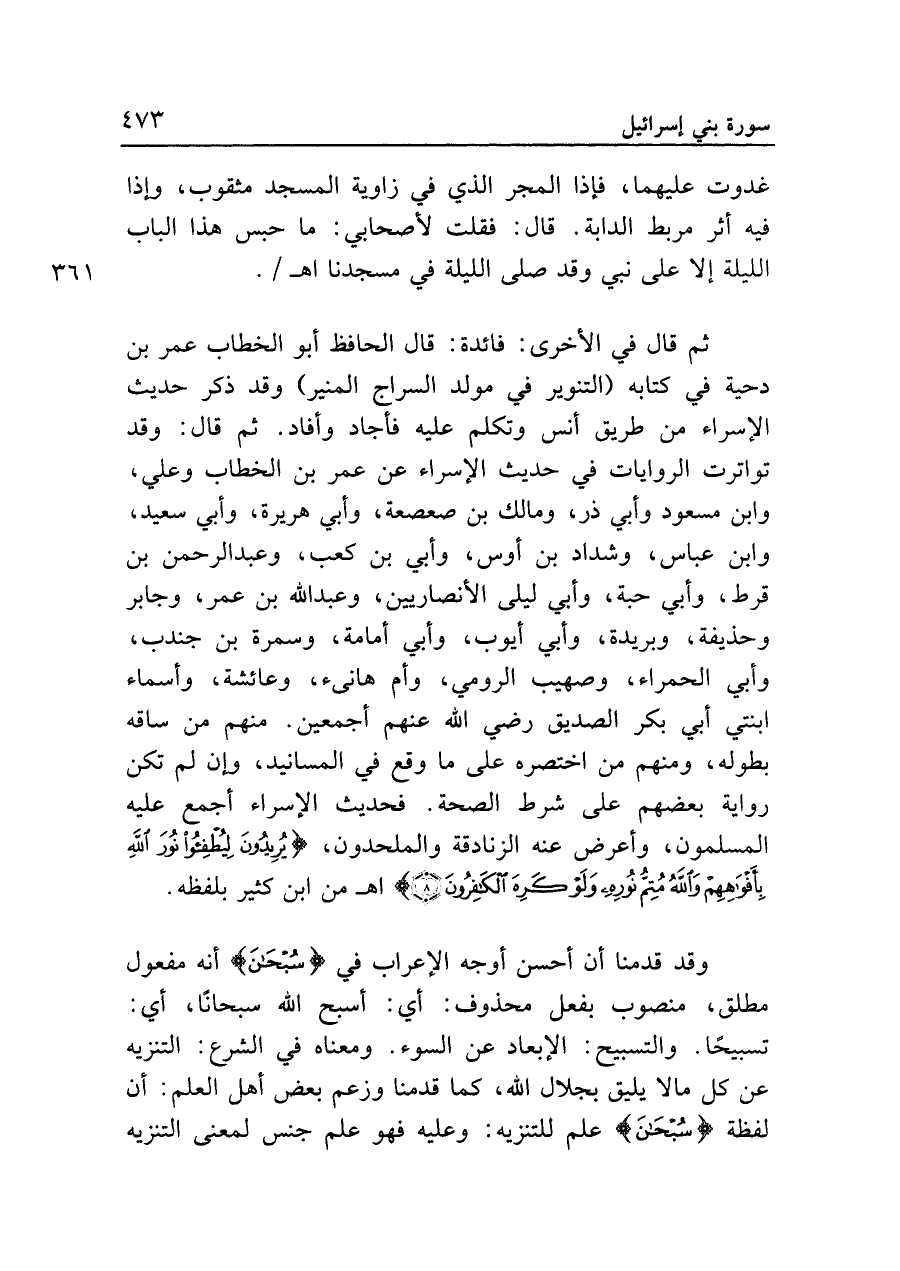 ثم قال في الأخرى: فائدة: قال الحافظ أبو الخطاب عمر بن دحية في كتابه (التنوير في مولد السراج المنير) وقد ذكر حديث الإسراء من طريق أنس وتكلم عليه فأجاد وأفاد. ثم قال: وقد تواترت الروايات في حديث الإسراء عن عمر بن الخطاب وعلي، وابن مسعود وأبي ذر، ومالك بن صعصعة، وأبي هريرة، وأبي سعيد، وابن عباس، وشداد بن أوس، وأبي بن كعب، وعبد الرحمن بن قرط، وأبي حبة، وأبي ليلى الأنصاريين، وعبد الله بن عمر، وجابر وحذيفة، وبريدة، وأبي أيوب، وأبي أمامة، وسمرة بن جندب، وأبي الحمراء، وصهيب الرومي، وأم هانئ، وعائشة، وأسماء ابنتي أبي بكر الصديق رضي الله عنهم أجمعين. منهم من ساقه بطوله، ومنهم من اختصره على ما وقع في المسانيد، وإن لم تكن رواية بعضهم على شرط الصحة. فحديث الإسراء أجمع عليه المسلمون، وأعرض عنه الزنادقة والملحدون، {يُرِيدُونَ لِيُطْفِئُوا نُورَ اللَّهِ بِأَفْوَاهِهِمْ وَاللَّهُ مُتِمُّ نُورِهِ وَلَوْ كَرِهَ الْكَافِرُونَ (٨)} اهـ من ابن كثير بلفظه.