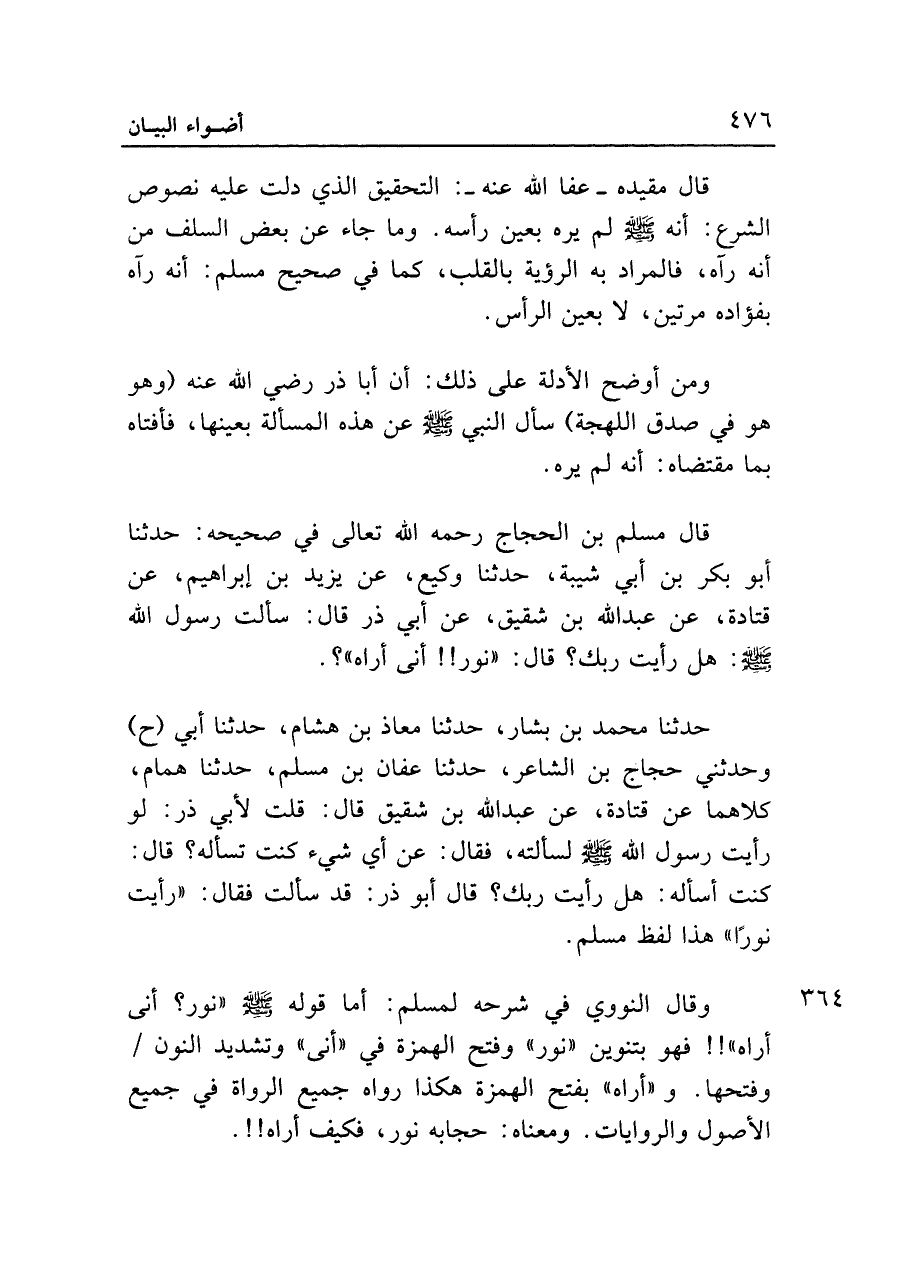 قال مسلم بن الحجاج رحمه الله تعالى في صحيحه: حدثنا أبو بكر بن أبي شيبة، حدثنا وكيع، عن يزيد بن إبراهيم، عن قتادة، عن عبد الله بن شقيق، عن أبي ذر قال: سألت رسول الله - صلى الله عليه وسلم -: هل رأيت ربك؟ قال: "نور!! أنى أراه"؟.