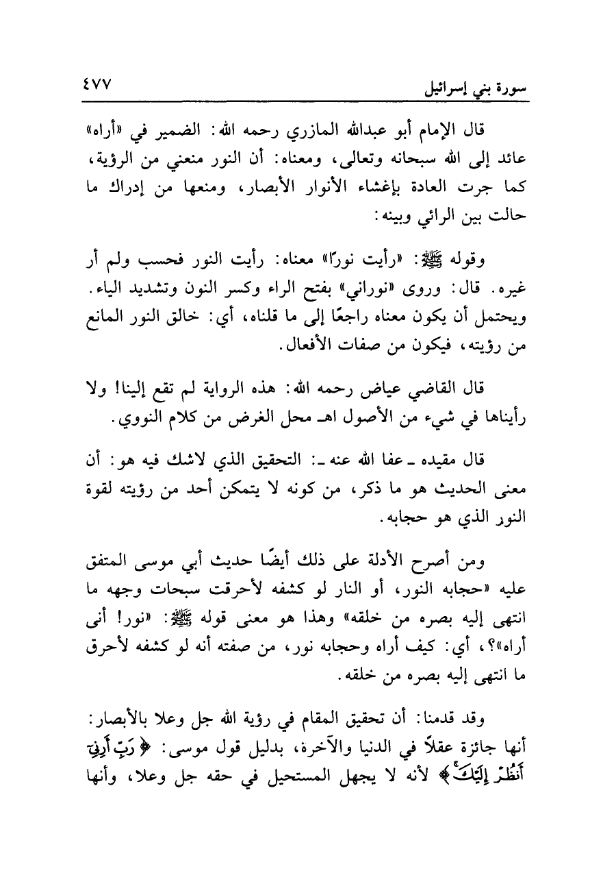 ومن أصرح الأدلة على ذلك أيضًا حديث أبي موسى المتفق عليه "حجابه النور، أو النار لو كشفه لأحرقت سبحات وجهه ما انتهى إليه بصره من خلقه" وهذا هو معنى قوله - صلى الله عليه وسلم -: "نور! أنى أراه"؟، أي: كيف أراه وحجابه نور، من صفته أنه لو كشفه لأحرق ما انتهى إليه بصره من خلقه.