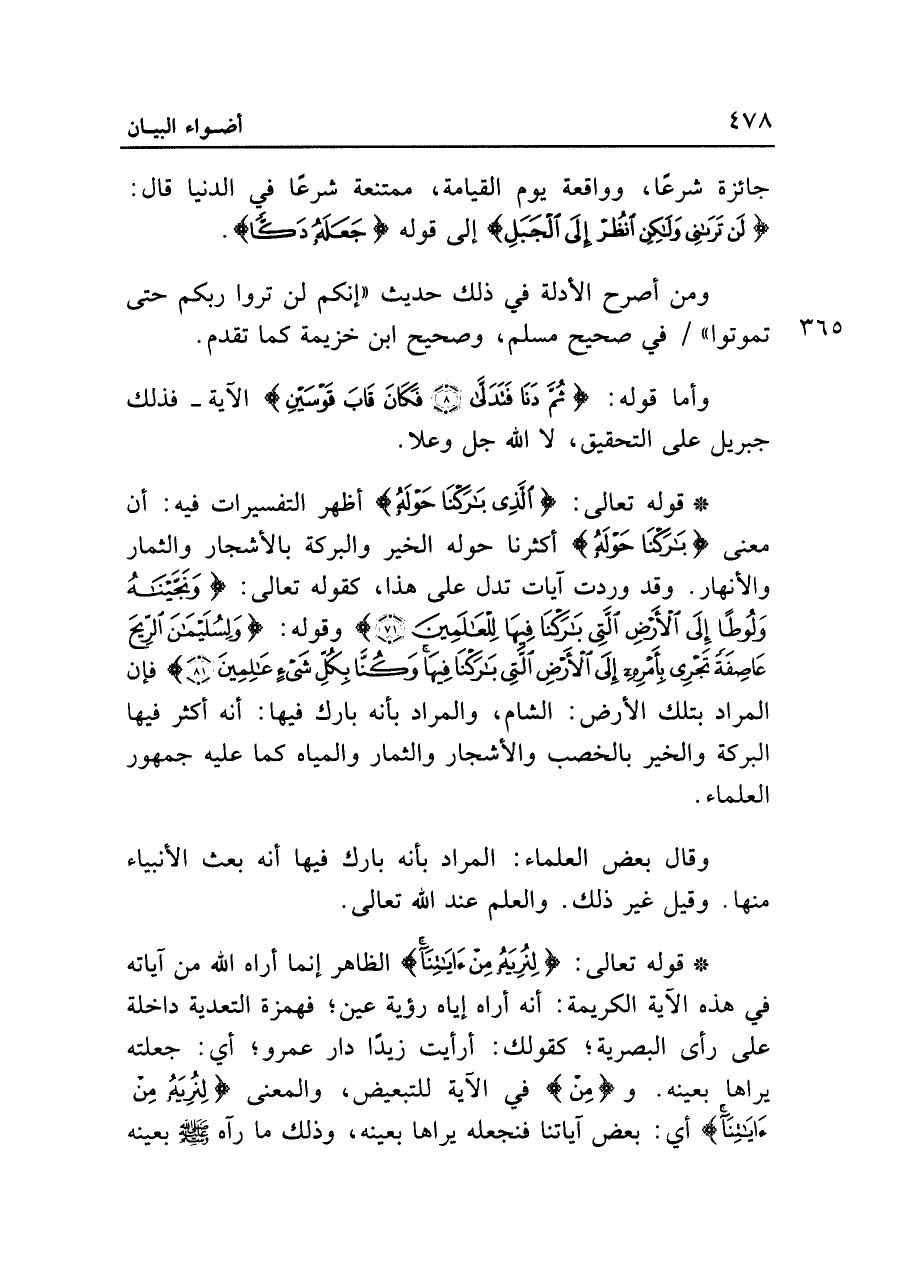 • قوله تعالى: {الَّذِي بَارَكْنَا حَوْلَهُ} أظهر التفسيرات فيه: أن معنى {بَارَكْنَا حَوْلَهُ} أكثرنا حوله الخير والبركة بالأشجار والثمار والأنهار. وقد وردت آيات تدل على هذا، كقوله تعالى: {وَنَجَّيْنَاهُ وَلُوطًا إِلَى الْأَرْضِ الَّتِي بَارَكْنَا فِيهَا لِلْعَالَمِينَ (٧١)} وقوله: {وَلِسُلَيْمَانَ الرِّيحَ عَاصِفَةً تَجْرِي بِأَمْرِهِ إِلَى الْأَرْضِ الَّتِي بَارَكْنَا فِيهَا وَكُنَّا بِكُلِّ شَيْءٍ عَالِمِينَ (٨١)} فإن المراد بتلك الأرض: الشام، والمراد بأنه بارك فيها: أنه أكثر فيها البركة والخير بالخصب والأشجار والثمار والمياه كما عليه جمهور العلماء.