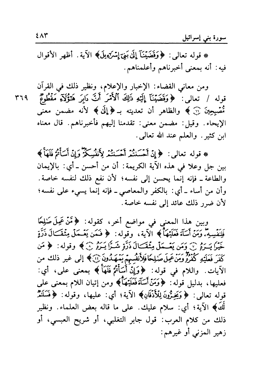 وبين هذا المعنى في مواضع أخر، كقوله: {مَنْ عَمِلَ صَالِحًا فَلِنَفْسِهِ وَمَنْ أَسَاءَ فَعَلَيْهَا} الآية، وقوله: {فَمَنْ يَعْمَلْ مِثْقَالَ ذَرَّةٍ خَيْرًا يَرَهُ (٧) وَمَنْ يَعْمَلْ مِثْقَالَ ذَرَّةٍ شَرًّا يَرَهُ (٨)} وقوله: {مَنْ كَفَرَ فَعَلَيْهِ كُفْرُهُ وَمَنْ عَمِلَ صَالِحًا فَلِأَنْفُسِهِمْ يَمْهَدُونَ (٤٤)} إلى غير ذلك من الآيات. واللام في قوله: {وَإِنْ أَسَأْتُمْ فَلَهَا} بمعنى على، أي: فعليها، بدليل قوله: {وَمَنْ أَسَاءَ فَعَلَيْهَا} ومن إتيان اللام بمعنى على قوله تعالى: {وَيَخِرُّونَ لِلْأَذْقَانِ} الآية؛ أي: عليها، وقوله: {فَسَلَامٌ لَكَ} الآية؛ أي: سلام عليك. على ما قاله بعض العلماء. ونظير ذلك من كلام العرب: قول جابر التغلبي، أو شريح العبسي، أو زهير المزني أو غيرهم:
