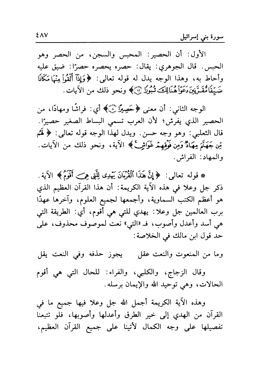 • قوله تعالى: {إِنَّ هَذَا الْقُرْآنَ يَهْدِي لِلَّتِي هِيَ أَقْوَمُ} الآية. ذكر جل وعلا في هذه الآية الكريمة: أن هذا القرآن العظيم الذي هو أعظم الكتب السماوية، وأجمعها لجميع العلوم، وآخرها عهدًا برب العالمين جل وعلا: يهدي للتي هي أقوم، أي: الطريقة التي هي أسد وأعدل وأصوب، فـ"التي" نعت لموصوف محذوف، على حد قول ابن مالك في الخلاصة: