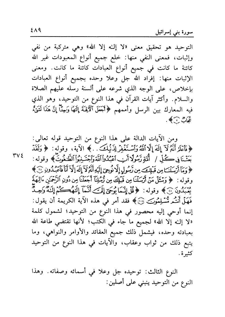 ومن الآيات الدالة على هذا النوع من التوحيد قوله تعالى: {فَاعْلَمْ أَنَّهُ لَا إِلَهَ إِلَّا اللَّهُ وَاسْتَغْفِرْ لِذَنْبِكَ . .} الآية، وقوله: {وَلَقَدْ بَعَثْنَا فِي كُلِّ أُمَّةٍ رَسُولًا أَنِ اعْبُدُوا اللَّهَ وَاجْتَنِبُوا الطَّاغُوتَ} وقوله: {وَمَا أَرْسَلْنَا مِنْ قَبْلِكَ مِنْ رَسُولٍ إِلَّا نُوحِي إِلَيْهِ أَنَّهُ لَا إِلَهَ إِلَّا أَنَا فَاعْبُدُونِ (٢٥)} وقوله: {وَاسْأَلْ مَنْ أَرْسَلْنَا مِنْ قَبْلِكَ مِنْ رُسُلِنَا أَجَعَلْنَا مِنْ دُونِ الرَّحْمَنِ آلِهَةً يُعْبَدُونَ (٤٥)} وقوله: {قُلْ إِنَّمَا يُوحَى إِلَيَّ أَنَّمَا إِلَهُكُمْ إِلَهٌ وَاحِدٌ فَهَلْ أَنْتُمْ مُسْلِمُونَ (١٠٨)} فقد أمر في هذه الآية الكريمة أن يقول: إنما أوحي إليه محصور في هذا النوع من التوحيد؛ لشمول كلمة "لا إله إلا الله" لجميع ما جاء في الكتب؛ لأنها تقتضي طاعة الله بعبادته وحده، فيشمل ذلك جميع العقائد والأوامر والنواهي، وما يتبع ذلك من ثواب وعقاب، والآيات في هذا النوع من التوحيد كثيرة.