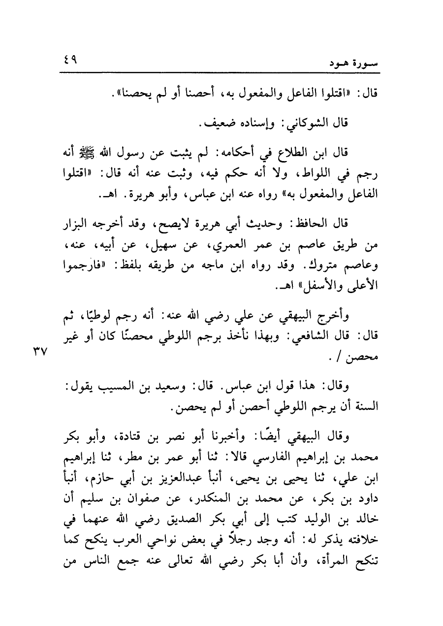 قال الحافظ: وحديث أبي هريرة لا يصح، وقد أخرجه البزار من طريق عاصم بنُ عمر العمري، عن سهيل، عن أبيه، عنه، وعاصم متروك. وقد رواه ابن ماجه من طريقه بلفظ: "فارجموا الأعلى والأسفل" اهـ.