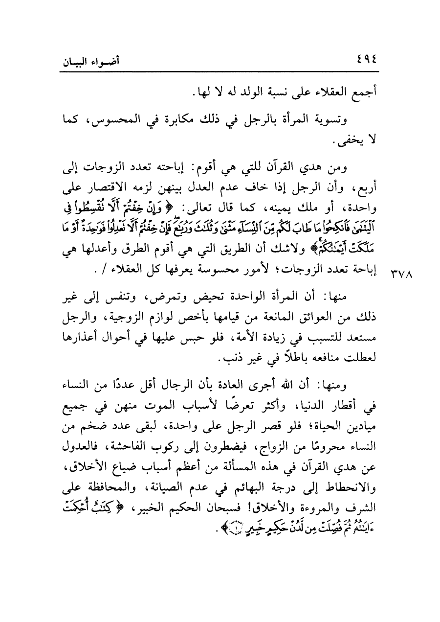 ومن هدي القرآن للتي هي أقوم: إباحته تعدد الزوجات إلى أربع، وأن الرجل إذا خاف عدم العدل بينهن لزمه الاقتصار على واحدة، أو ملك يمينه، كما قال تعالى: {وَإِنْ خِفْتُمْ أَلَّا تُقْسِطُوا فِي الْيَتَامَى فَانْكِحُوا مَا طَابَ لَكُمْ مِنَ النِّسَاءِ مَثْنَى وَثُلَاثَ وَرُبَاعَ فَإِنْ خِفْتُمْ أَلَّا تَعْدِلُوا فَوَاحِدَةً أَوْ مَا مَلَكَتْ أَيْمَانُكُمْ} ولا شك أن الطريق التي هي أقوم الطرق وأعدلها هي إباحة تعدد الزوجات؛ لأمور محسوسة يعرفها كل العقلاء.