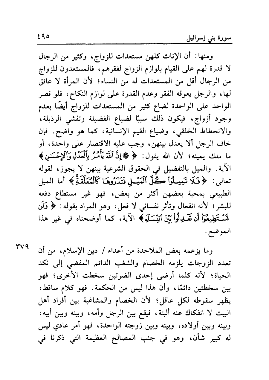 ومنها: أن الإناث كلهن مستعدات للزواج، وكثير من الرجال لا قدرة لهم على القيام بلوازم الزواج لفقرهم، فالمستعدون للزواج من الرجال أقل من المستعدات له من النساء؛ لأن المرأة لا عائق لها، والرجل يعوقه الفقر وعدم القدرة على لوازم النكاح، فلو قصر الواحد على الواحدة لضاع كثير من المستعدات للزواج أيضًا بعدم وجود أزواج، فيكون ذلك سببا لضياع الفضيلة وتفشي الرذيلة، والانحطاط الخلقي، وضياع القيم الإنسانية، كما هو واضح. فإن خاف الرجل ألا يعدل بينهن، وجب عليه الاقتصار على واحدة، أو ما ملك يمينه؛ لأن الله يقول: {إِنَّ اللَّهَ يَأْمُرُ بِالْعَدْلِ وَالْإِحْسَانِ} الآية. والميل بالتفضيل في الحقوق الشرعية بينهن لا يجوز، لقوله تعالى: {فَلَا تَمِيلُوا كُلَّ الْمَيْلِ فَتَذَرُوهَا كَالْمُعَلَّقَةِ} أما الميل الطبيعي بمحبة بعضهن أكثر من بعض، فهو غير مستطاع دفعه للبشر؛ لأنه انفعال وتأثر نفساني لا فعل، وهو المراد بقوله: {وَلَنْ تَسْتَطِيعُوا أَنْ تَعْدِلُوا بَيْنَ النِّسَاءِ} الآية، كما أوضحناه في غير هذا الموضع.