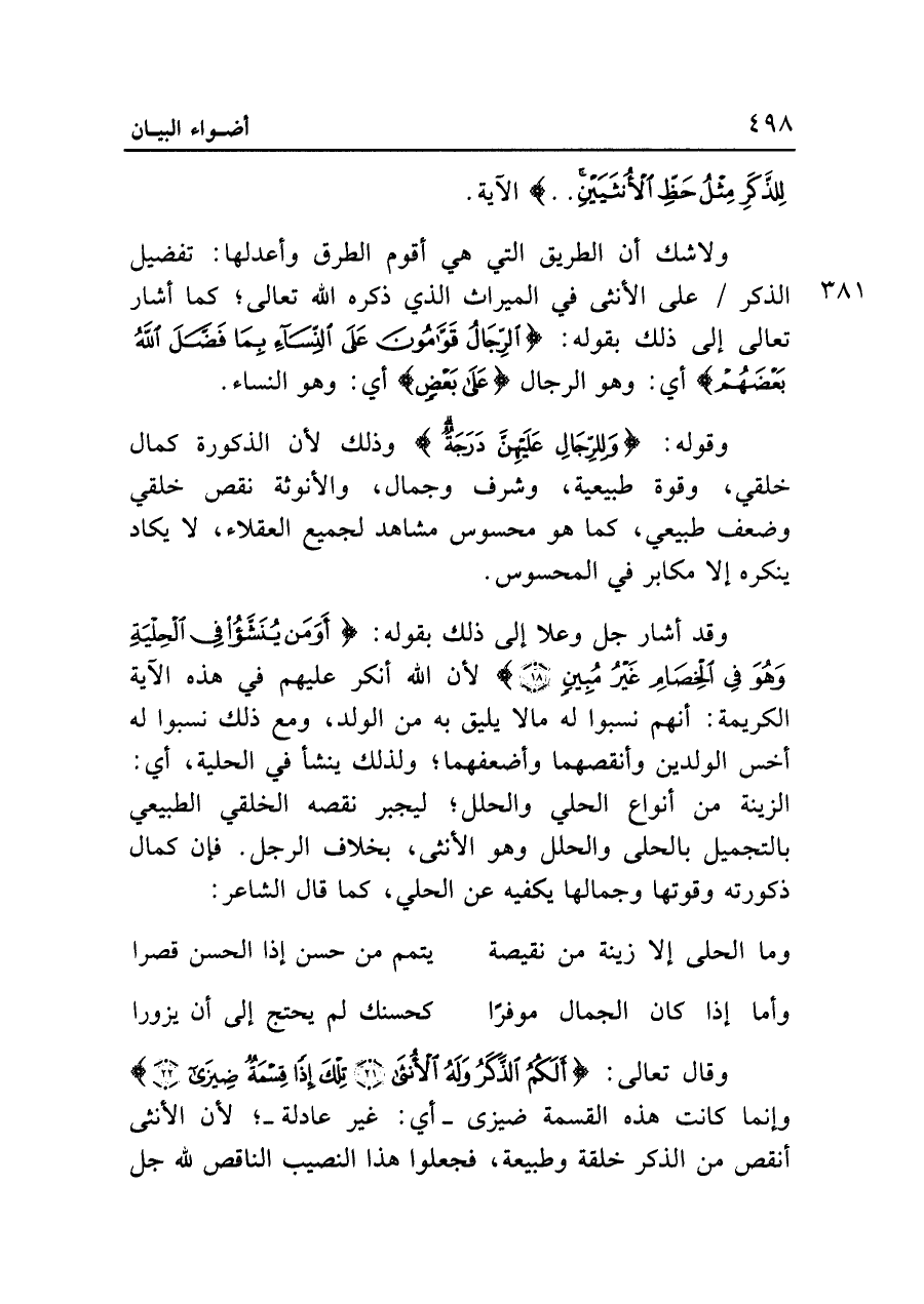 وقد أشار جل وعلا إلى ذلك بقوله: {أَوَمَنْ يُنَشَّأُ فِي الْحِلْيَةِ وَهُوَ فِي الْخِصَامِ غَيْرُ مُبِينٍ (١٨)} لأن الله أنكر عليهم في هذه الآية الكريمة: أنهم نسبوا له ما لا يليق به من الولد، ومع ذلك نسبوا له أخس الولدين وأنقصهما وأضعفهما؛ ولذلك ينشأ في الحلية، أي: الزينة من أنواع الحلي والحلل؛ ليجبر نقصه الخلقي الطبيعي بالتجميل بالحلى والحلل وهو الأنثى، بخلاف الرجل. فإن كمال ذكورته وقوتها وجمالها يكفيه عن الحلي، كما قال الشاعر: