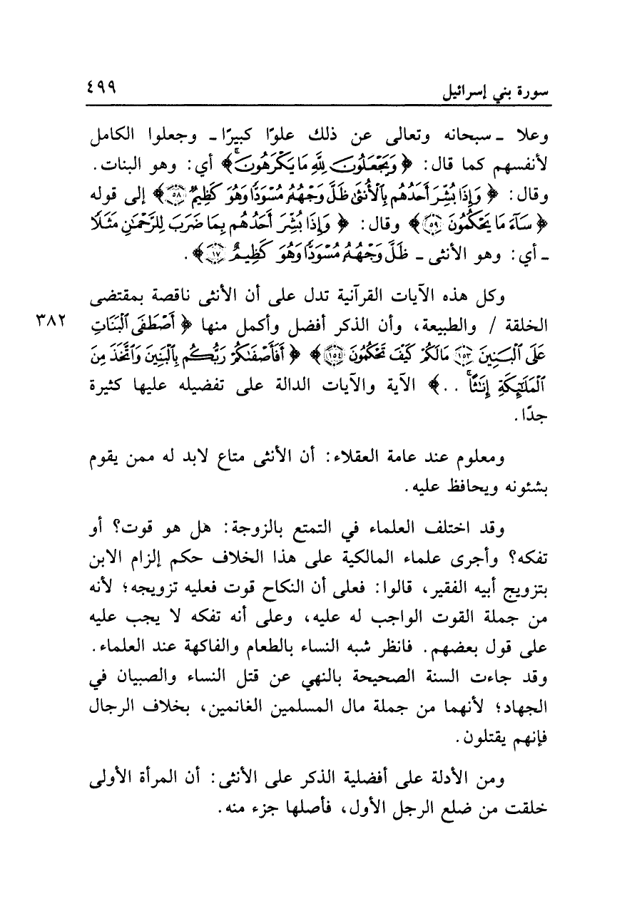 وكل هذه الآيات القرآنية تدل على أن الأنثى ناقصة بمقتضى الخلقة والطبيعة، وأن الذكر أفضل وأكمل منها {أَصْطَفَى الْبَنَاتِ عَلَى الْبَنِينَ (١٥٣) مَا لَكُمْ كَيْفَ تَحْكُمُونَ (١٥٤)} {أَفَأَصْفَاكُمْ رَبُّكُمْ بِالْبَنِينَ وَاتَّخَذَ مِنَ الْمَلَائِكَةِ إِنَاثًا .. } الآية والآيات الدالة على تفضيله عليها كثيرة جدًا.