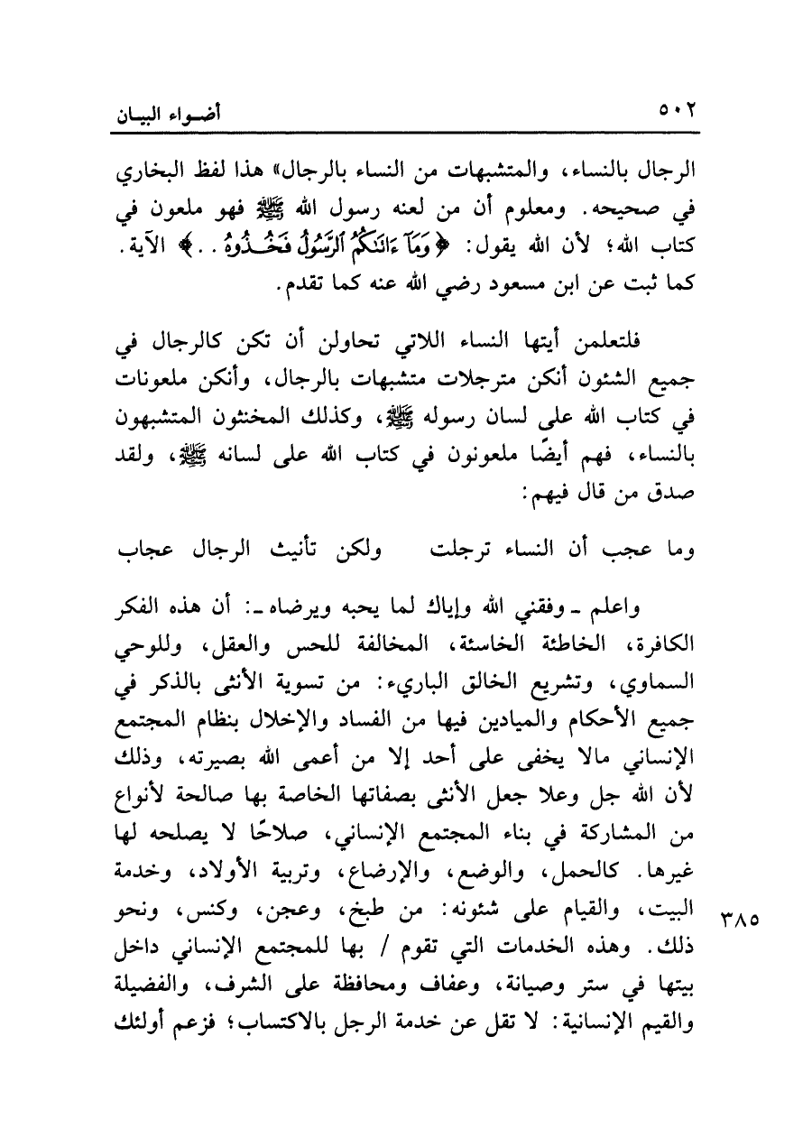 فلتعلمن أيتها النساء اللاتي تحاولن أن تكن كالرجال في جميع الشئون أنكن مترجلات متشبهات بالرجال، وأنكن ملعونات في كتاب الله على لسان رسوله - صلى الله عليه وسلم -، وكذلك المخنثون المتشبهون بالنساء، فهم أيضًا ملعونون في كتاب الله على لسانه - صلى الله عليه وسلم -، ولقد صدق من قال فيهم: