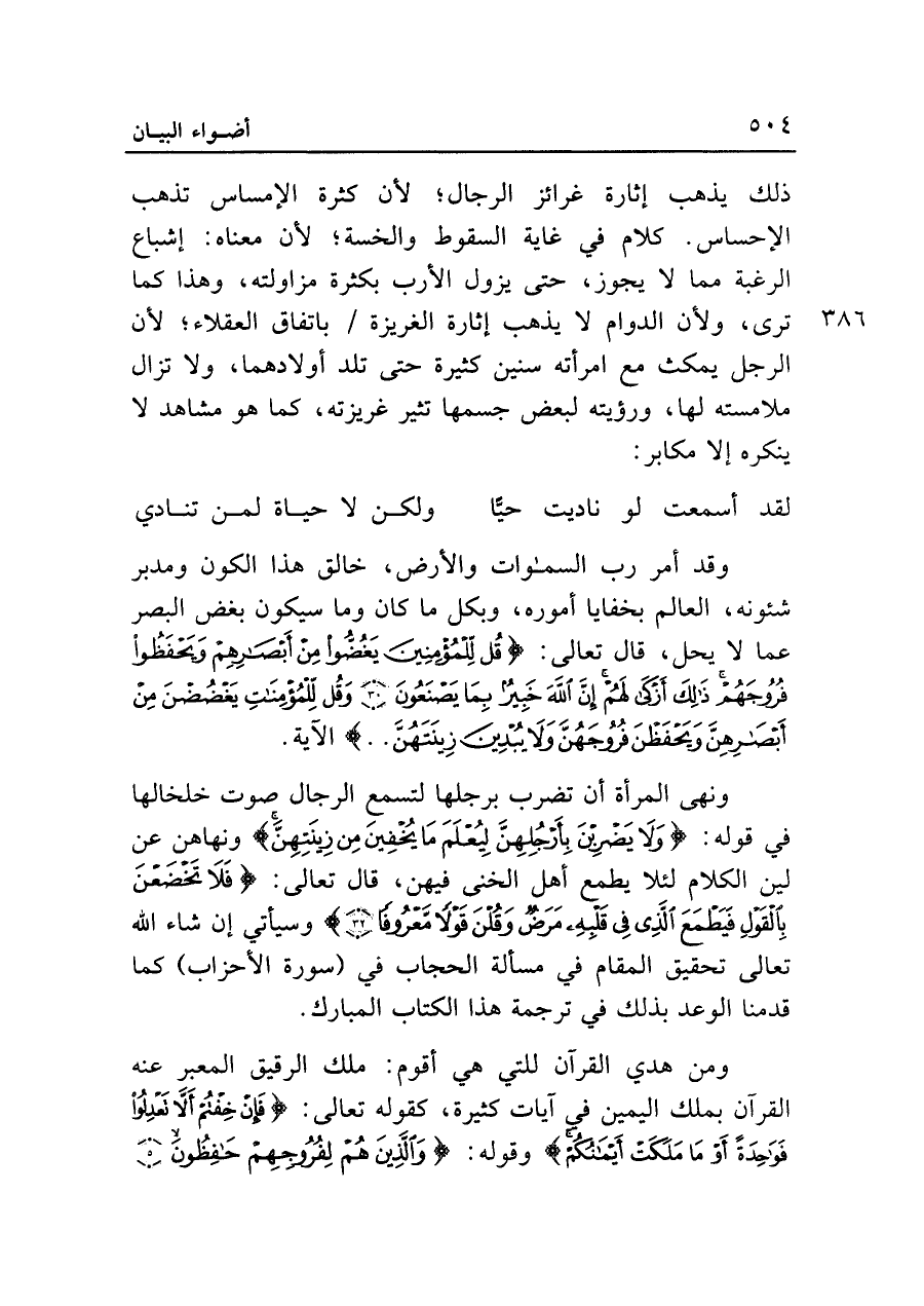 ونهى المرأة أن تضرب برجلها لتسمع الرجال صوت خلخالها في قوله: {وَلَا يَضْرِبْنَ بِأَرْجُلِهِنَّ لِيُعْلَمَ مَا يُخْفِينَ مِنْ زِينَتِهِنَّ} ونهاهن عن لين الكلام لئلا يطمع أهل الخنى فيهن، قال تعالى: {فَلَا تَخْضَعْنَ بِالْقَوْلِ فَيَطْمَعَ الَّذِي فِي قَلْبِهِ مَرَضٌ وَقُلْنَ قَوْلًا مَعْرُوفًا (٣٢)} وسيأتي إن شاء الله تعالى تحقيق المقام في مسألة الحجاب في (سورة الأحزاب) كما قدمنا الوعد بذلك في ترجمة هذا الكتاب المبارك.