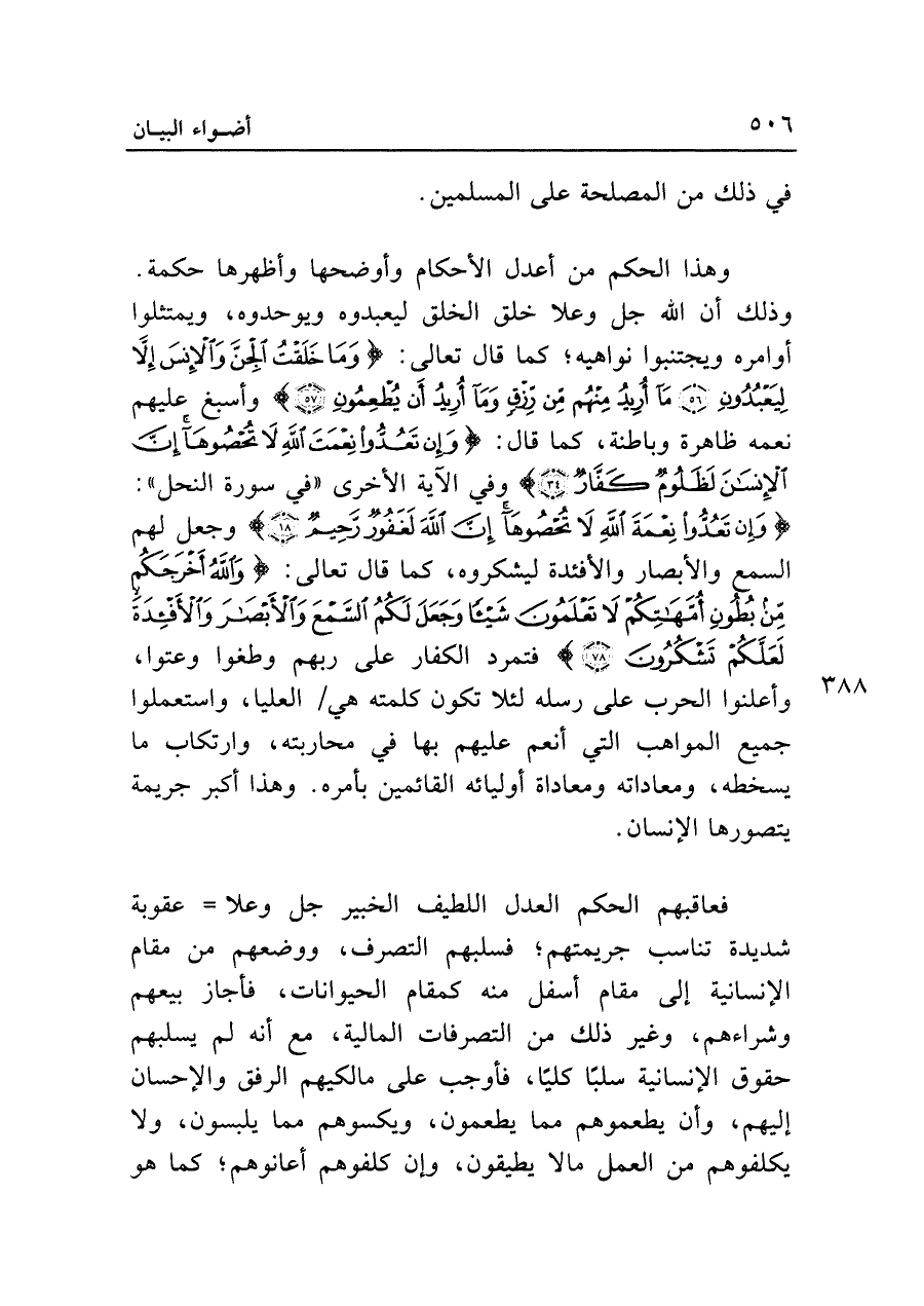 فعاقبهم الحكم العدل اللطيف الخبير جل وعلا = عقوبة شديدة تناسب جريمتهم؛ فسلبهم التصرف، ووضعهم من مقام الإنسانية إلى مقام أسفل منه كمقام الحيوانات، فأجاز بيعهم وشراءهم، وغير ذلك من التصرفات المالية، مع أنه لم يسلبهم حقوق الإنسانية سلبًا كليًا، فأوجب على مالكيهم الرفق والإحسان إليهم، وأن يطعموهم مما يطعمون، ويكسوهم مما يلبسون، ولا يكلفوهم من العمل ما لا يطيقون، وإن كلفوهم أعانوهم؛ كما هو