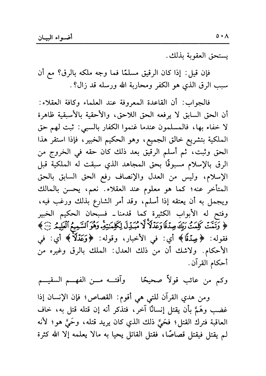 فالجواب: أن القاعدة المعروفة عند العلماء وكافة العقلاء: أن الحق السابق لا يرفعه الحق اللاحق، والأحقية بالأسبقية ظاهرة لا خفاء بها، فالمسلمون عندما غنموا الكفار بالسبي: ثبت لهم حق الملكية بتشريع خالق الجميع، وهو الحكيم الخبير، فإذا استقر هذا الحق وثبت، ثم أسلم الرقيق بعد ذلك كان حقه في الخروج من الرق بالإسلام مسبوقًا بحق المجاهد الذي سبقت له الملكية قبل الإسلام، وليس من العدل والإنصاف رفع الحق السابق بالحق المتأخر عنه؛ كما هو معلوم عند العقلاء. نعم، يحسن بالمالك ويجمل به أن يعتقه إذا أسلم، وقد أمر الشارع بذلك ورغب فيه، وفتح له الأبواب الكثيرة كما قدمنا - فسبحان الحكيم الخبير {وَتَمَّتْ كَلِمَتُ رَبِّكَ صِدْقًا وَعَدْلًا لَا مُبَدِّلَ لِكَلِمَاتِهِ وَهُوَ السَّمِيعُ الْعَلِيمُ (١١٥)} فقوله: {صِدْقًا} أي: في الأخبار، وقوله: {وَعَدْلًا} أي: في الأحكام. ولا شك أن من ذلك العدل: الملك بالرق وغيره من أحكام القرآن.