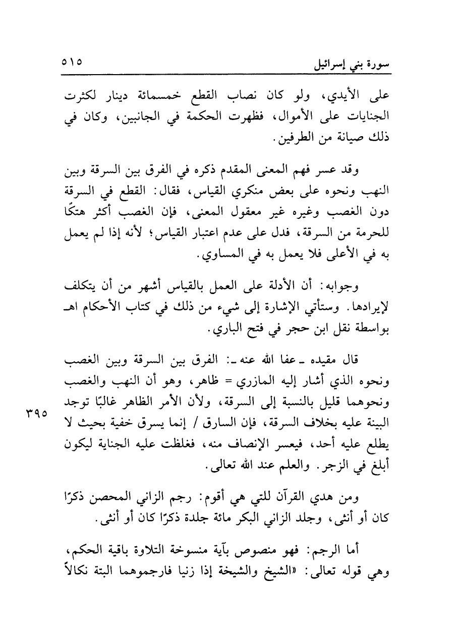 قال مقيده -عفا الله عنه-: الفرق بين السرقة وبين الغصب ونحوه الذي أشار إليه المازري = ظاهر، وهو أن النهب والغصب ونحوهما قليل بالنسبة إلى السرقة، ولأن الأمر الظاهر غالبًا توجد البينة عليه بخلاف السرقة، فإن السارق إنما يسرق خفية بحيث لا يطلع عليه أحد، فيعسر الإنصاف منه، فغلظت عليه الجناية ليكون أبلغ في الزجر. والعلم عند الله تعالى.