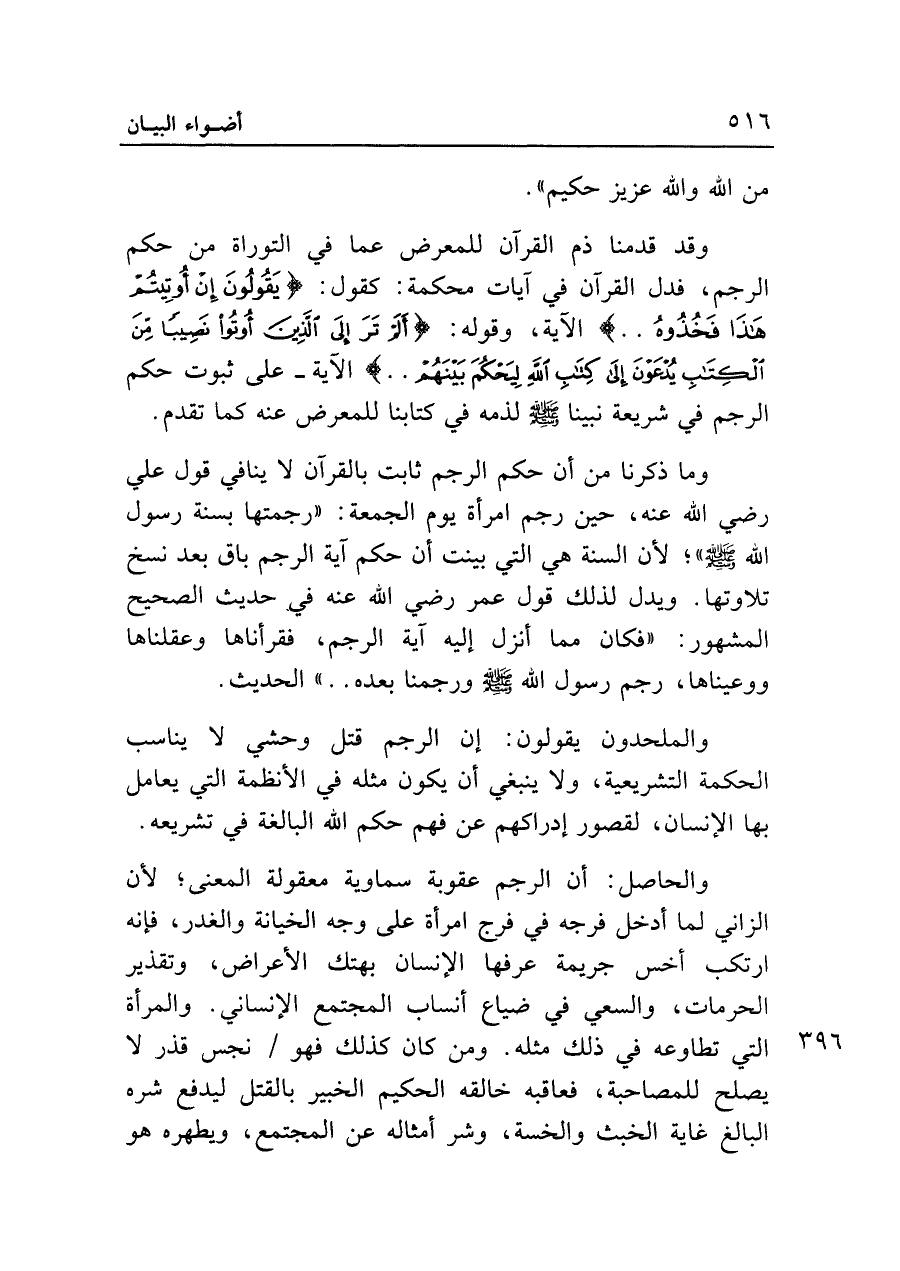 وقد قدمنا ذم القرآن للمعرض عما في التوراة من حكم الرجم، فدل القرآن في آيات محكمة: كقول: {يَقُولُونَ إِنْ أُوتِيتُمْ هَذَا فَخُذُوهُ .. } الآية، وقوله: {أَلَمْ تَرَ إِلَى الَّذِينَ أُوتُوا نَصِيبًا مِنَ الْكِتَابِ يُدْعَوْنَ إِلَى كِتَابِ اللَّهِ لِيَحْكُمَ بَيْنَهُمْ .. } الآية - على ثبوت حكم الرجم في شريعة نبينا - صلى الله عليه وسلم - لذمه في كتابنا للمعرض عنه كما تقدم.