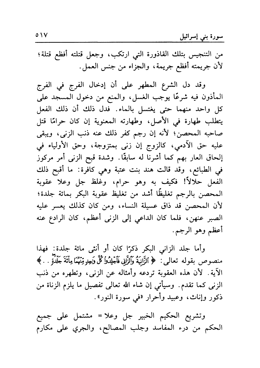 وقد دل الشرع المطهر على أن إدخال الفرج في الفرج المأذون فيه شرعًا يوجب الغسل، والمنع من دخول المسجد على كل واحد منهما حتى يغتسل بالماء. فدل ذلك أن ذلك الفعل يتطلب طهارة في الأصل، وطهارته المعنوية إن كان حرامًا قتل صاحبه المحصن؛ لأنه إن رجم كفر ذلك عنه ذنب الزنى، ويبقى عليه حق الآدمي، كالزوج إن زنى بمتزوجة، وحق الأولياء في إلحاق العار بهم كما أشرنا له سابقًا. وشدة قبح الزنى أمر مركوز في الطبائع، وقد قالت هند بنت عتبة وهي كافرة: ما أقبح ذلك الفعل حلالًا! فكيف به وهو حرام، وغلظ جل وعلا عقوبة المحصن بالرجم تغليظًا أشد من تغليظ عقوبة البكر بمائة جلدة؛ لأن المحصن قد ذاق عسيلة النساء، ومن كان كذلك يعسر عليه الصبر عنهن، فلما كان الداعي إلى الزنى أعظم، كان الرادع عنه أعظم وهو الرجم.