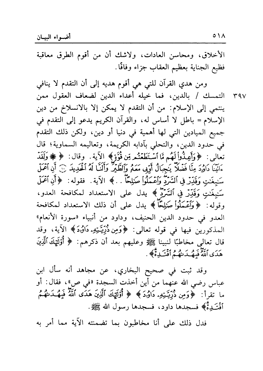 ومن هدي القرآن للتي هي أقوم هديه إلى أن التقدم لا ينافي التمسك بالدين، فما خيله أعداء الدين لضعاف العقول ممن ينتمي إلى الإسلام: من أن التقدم لا يمكن إلا بالانسلاخ من دين الإسلام = باطل لا أساس له، والقرآن الكريم يدعو إلى التقدم في جميع الميادين التي لها أهمية في دنيا أو دين، ولكن ذلك التقدم في حدود الدين، والتحلي بآدابه الكريمة، وتعاليمه السماوية؛ قال تعالى: {وَأَعِدُّوا لَهُمْ مَا اسْتَطَعْتُمْ مِنْ قُوَّةٍ} الآية. وقال: {وَلَقَدْ آتَيْنَا دَاوُودَ مِنَّا فَضْلًا يَاجِبَالُ أَوِّبِي مَعَهُ وَالطَّيْرَ وَأَلَنَّا لَهُ الْحَدِيدَ (١٠) أَنِ اعْمَلْ سَابِغَاتٍ وَقَدِّرْ فِي السَّرْدِ وَاعْمَلُوا صَالِحًا .. } الآية. فقوله: {أَنِ اعْمَلْ سَابِغَاتٍ وَقَدِّرْ فِي السَّرْدِ} يدل على الاستعداد لمكافحة العدو، وقوله: {وَاعْمَلُوا صَالِحًا} يدل على أن ذلك الاستعداد لمكافحة العدو في حدود الدين الحنيف، وداود من أنبياء "سورة الأنعام" المذكورين فيها في قوله تعالى: {وَمِنْ ذُرِّيَّتِهِ دَاوُودَ} الآية، وقد قال تعالى مخاطبًا لنبينا - صلى الله عليه وسلم - وعليهم بعد أن ذكرهم: {أُولَئِكَ الَّذِينَ هَدَى اللَّهُ فَبِهُدَاهُمُ اقْتَدِهْ}.