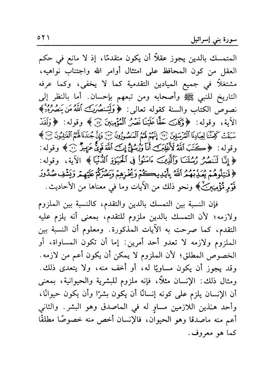 فإن النسبة بين التمسك بالدين والتقدم، كالنسبة بين الملزوم ولازمه؛ لأن التمسك بالدين ملزوم للتقدم، بمعنى أنه يلزم عليه التقدم، كما صرحت به الآيات المذكورة. ومعلوم أن النسبة بين الملزوم ولازمه لا تعدو أحد أمرين: إما أن تكون المساواة، أو الخصوص المطلق؛ لأن الملزوم لا يمكن أن يكون أعم من لازمه. وقد يجوز أن يكون مساويًا له، أو أخف منه، ولا يتعدى ذلك. ومثال ذلك: الإنسان مثلا، فإنه ملزوم للبشرية والحيوانية، بمعنى أن الإنسان يلزم على كونه إنسانًا أن يكون بشرًا وأن يكون حيوانًا، وأحد هذين اللازمين مساوٍ له في الماصدق وهو البشر. والثاني أعم منه ماصدقا وهو الحيوان، فالإنسان أخص منه خصوصًا مطلقًا كما هو معروف.