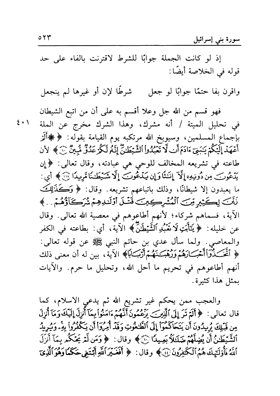 فهو قسم من الله جل وعلا أقسم به على أن من اتبع الشيطان في تحليل الميتة أنه مشرك، وهذا الشرك مخرج عن الملة بإجماع المسلمين، وسيوبخ الله مرتكبه يوم القيامة بقوله: {أَلَمْ أَعْهَدْ إِلَيْكُمْ يَابَنِي آدَمَ أَنْ لَا تَعْبُدُوا الشَّيْطَانَ إِنَّهُ لَكُمْ عَدُوٌّ مُبِينٌ (٦٠)} لأن طاعته في تشريعه المخالف للوحي هي عبادته، وقال تعالى: {إِنْ يَدْعُونَ مِنْ دُونِهِ إِلَّا إِنَاثًا وَإِنْ يَدْعُونَ إِلَّا شَيْطَانًا مَرِيدًا (١١٧)} أي: ما يعبدون إلا شيطانًا، وذلك باتباعهم تشريعه. وقال: {وَكَذَلِكَ زَيَّنَ لِكَثِيرٍ مِنَ الْمُشْرِكِينَ قَتْلَ أَوْلَادِهِمْ شُرَكَاؤُهُمْ .. } الآية، فسماهم شركاء؛ لأنهم أطاعوهم في معصية الله تعالى. وقال عن خليله: {يَاأَبَتِ لَا تَعْبُدِ الشَّيْطَانَ} الآية، أي: بطاعته في الكفر والمعاصي. ولما سأل عدي بن حاتم النبي - صلى الله عليه وسلم - عن قوله تعالى: {اتَّخَذُوا أَحْبَارَهُمْ وَرُهْبَانَهُمْ أَرْبَابًا} الآية، بين له أن معنى ذلك أنهم أطاعوهم في تحريم ما أحل الله، وتحليل ما حرم. والآيات بمثل هذا كثيرة.