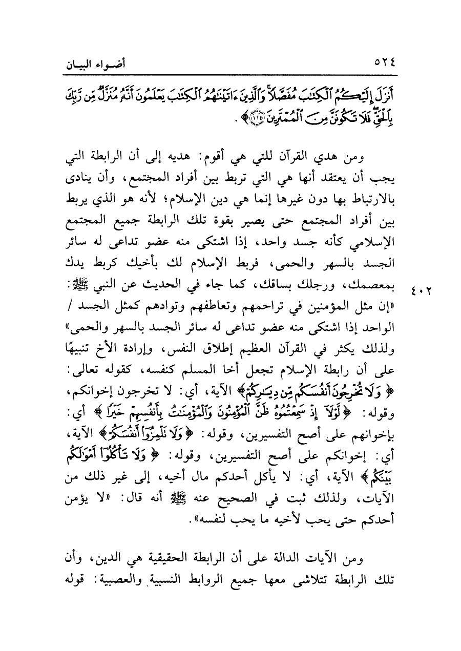 ومن هدي القرآن للتي هي أقوم: هديه إلى أن الرابطة التي يجب أن يعتقد أنها هي التي تربط بين أفراد المجتمع، وأن ينادى بالارتباط بها دون غيرها إنما هي دين الإسلام؛ لأنه هو الذي يربط بين أفراد المجتمع حتى يصير بقوة تلك الرابطة جميع المجتمع الإسلامي كأنه جسد واحد، إذا اشتكى منه عضو تداعى له سائر الجسد بالسهر والحمى، فربط الإسلام لك بأخيك كربط يدك بمعصمك، ورجلك بساقك، كما جاء في الحديث عن النبي - صلى الله عليه وسلم -: "إن مثل المؤمنين في تراحمهم وتعاطفهم وتوادهم كمثل الجسد الواحد إذا اشتكى منه عضو تداعى له سائر الجسد بالسهر والحمى" ولذلك يكثر في القرآن العظيم إطلاق النفس، وإرادة الأخ تنبيهًا على أن رابطة الإسلام تجعل أخا المسلم كنفسه، كقوله تعالى: {وَلَا تُخْرِجُونَ أَنْفُسَكُمْ مِنْ دِيَارِكُمْ} الآية، أي: لا تخرجون إخوانكم، وقوله: {لَوْلَا إِذْ سَمِعْتُمُوهُ ظَنَّ الْمُؤْمِنُونَ وَالْمُؤْمِنَاتُ بِأَنْفُسِهِمْ خَيْرًا} أي: بإخوانهم على أصح التفسيرين، وقوله: {وَلَا تَلْمِزُوا أَنْفُسَكُمْ} الآية، أي: إخوانكم على أصح التفسيرين، وقوله: {وَلَا تَأْكُلُوا أَمْوَالَكُمْ بَيْنَكُمْ} الآية، أي: لا يأكل أحدكم مال أخيه، إلى غير ذلك من الآيات، ولذلك ثبت في الصحيح عنه - صلى الله عليه وسلم - أنه قال: "لا يؤمن أحدكم حتى يحب لأخيه ما يحب لنفسه".