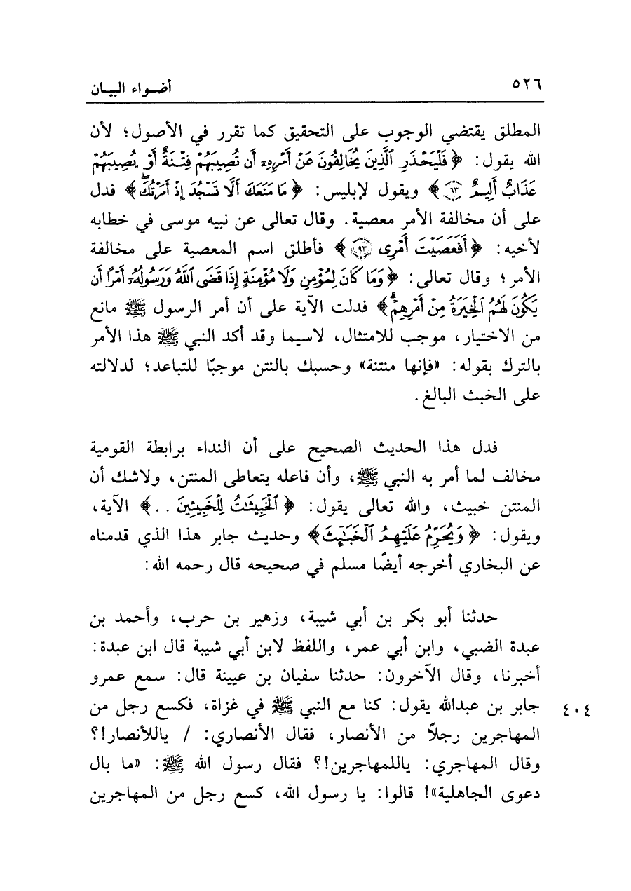 فدل هذا الحديث الصحيح على أن النداء برابطة القومية مخالف لما أمر به النبي - صلى الله عليه وسلم -، وأن فاعله يتعاطى المنتن، ولا شك أن المنتن خبيث، والله تعالى يقول: {الْخَبِيثَاتُ لِلْخَبِيثِينَ .. } الآية، ويقول: {وَيُحَرِّمُ عَلَيْهِمُ الْخَبَائِثَ} وحديث جابر هذا الذي قدمناه عن البخاري أخرجه أيضًا مسلم في صحيحه قال رحمه الله: