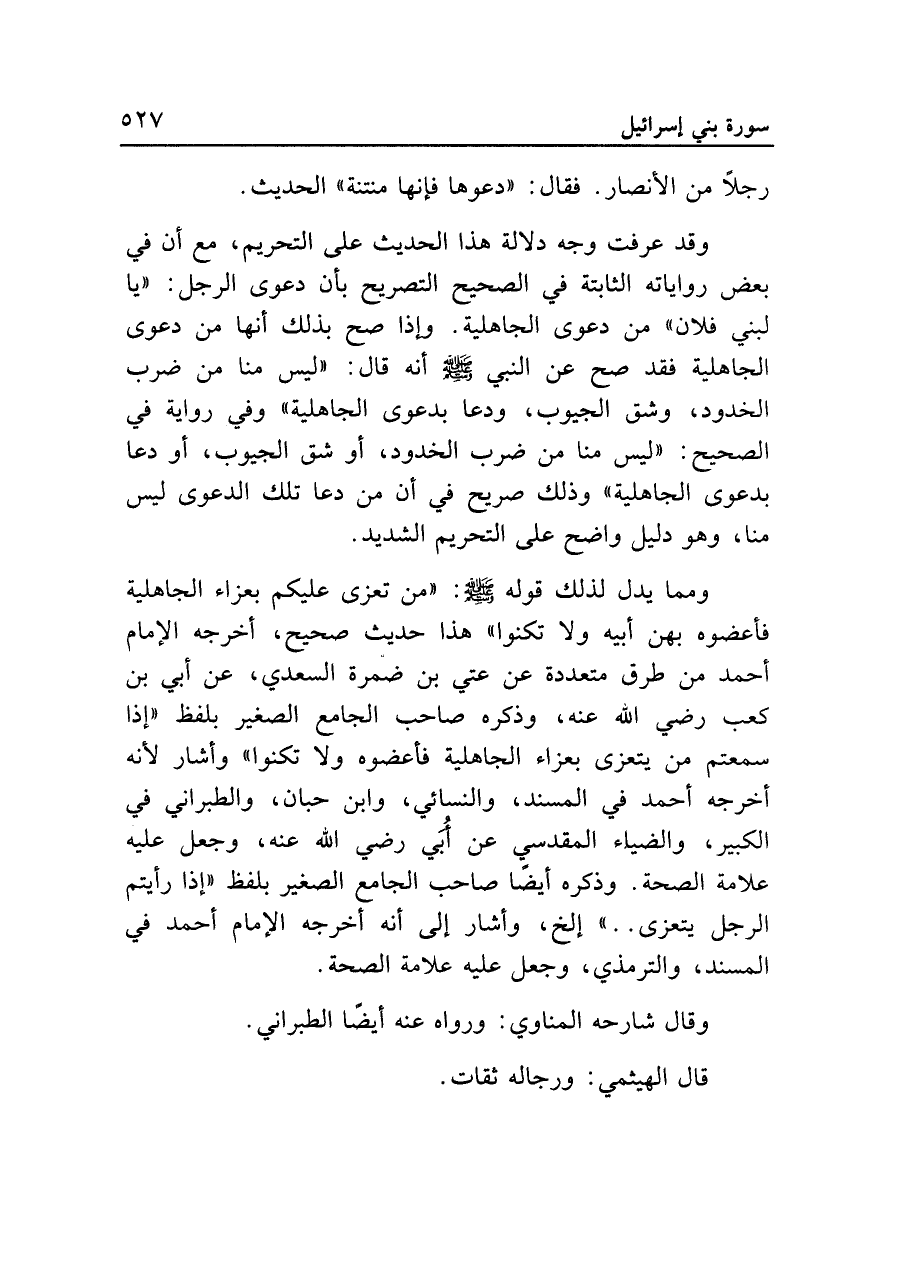 ومما يدل لذلك قوله - صلى الله عليه وسلم -: "من تعزى عليكم بعزاء الجاهلية فأعضوه بهن أبيه ولا تكنوا" هذا حديث صحيح، أخرجه الإمام أحمد من طرق متعددة عن عتي بن ضمرة السعدي، عن أبي بن كعب رضي الله عنه، وذكره صاحب الجامع الصغير بلفظ "إذا سمعتم من يتعزى بعزاء الجاهلية فأعضوه ولا تكنوا" وأشار لأنه أخرجه أحمد في المسند، والنسائي، وابن حبان، والطبراني في الكبير، والضياء المقدسي عن أُبَي رضي الله عنه، وجعل عليه علامة الصحة. وذكره أيضًا صاحب الجامع الصغير بلفظ "إذا رأيتم الرجل يتعزى .. " إلخ، وأشار إلى أنه أخرجه الإمام أحمد في المسند، والترمذي، وجعل عليه علامة الصحة.