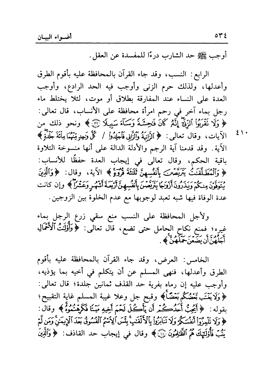 الرابع: النسب، وقد جاء القرآن بالمحافظة عليه بأقوم الطرق وأعدلها، ولذلك حرم الزنى وأوجب فيه الحد الرادع، وأوجب العدة على النساء عند المفارقة بطلاق أو موت، لئلا يختلط ماء رجل بماء آخر فى رحم امرأة محافظة على الأنساب، قال تعالى: {وَلَا تَقْرَبُوا الزِّنَا إِنَّهُ كَانَ فَاحِشَةً وَسَاءَ سَبِيلًا (٣٢)} ونحو ذلك من الآيات، وقال تعالى: {الزَّانِيَةُ وَالزَّانِي فَاجْلِدُوا كُلَّ وَاحِدٍ مِنْهُمَا مِائَةَ جَلْدَةٍ} الآية. وقد قدمنا آية الرجم والأدلة الدالة على أنها منسوخة التلاوة باقية الحكم، وقال تعالى في إيجاب العدة حفظًا للأنساب: {وَالْمُطَلَّقَاتُ يَتَرَبَّصْنَ بِأَنْفُسِهِنَّ ثَلَاثَةَ قُرُوءٍ} الآية، وقال: {وَالَّذِينَ يُتَوَفَّوْنَ مِنْكُمْ وَيَذَرُونَ أَزْوَاجًا يَتَرَبَّصْنَ بِأَنْفُسِهِنَّ أَرْبَعَةَ أَشْهُرٍ وَعَشْرًا} وإن كانت عدة الوفاة فيها شبه تعبد لوجوبها مع عدم الخلوة بين الزوجين.