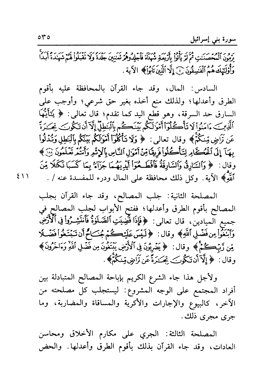 المصلحة الثالثة: الجري على مكارم الأخلاق ومحاسن العادات، وقد جاء القرآن بذلك بأقوم الطرق وأعدلها. والحض