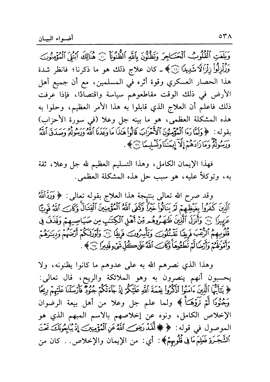 وَبَلَغَتِ الْقُلُوبُ الْحَنَاجِرَ وَتَظُنُّونَ بِاللَّهِ الظُّنُونَا (١٠) هُنَالِكَ ابْتُلِيَ الْمُؤْمِنُونَ وَزُلْزِلُوا زِلْزَالًا شَدِيدًا (١١)} -كان علاج ذلك هو ما ذكرنا؛ فانظر شدة هذا الحصار العسكري وقوة أثره في المسلمين، مع أن جميع أهل الأرض في ذلك الوقت مقاطعوهم سياسة واقتصادًا، فإذا عرفت ذلك فاعلم أن العلاج الذي قابلوا به هذا الأمر العظيم، وحلوا به هذه المشكلة العظمى، هو ما بينه جل وعلا (في سورة الأحزاب) بقوله: {وَلَمَّا رَأَى الْمُؤْمِنُونَ الْأَحْزَابَ قَالُوا هَذَا مَا وَعَدَنَا اللَّهُ وَرَسُولُهُ وَصَدَقَ اللَّهُ وَرَسُولُهُ وَمَا زَادَهُمْ إِلَّا إِيمَانًا وَتَسْلِيمًا (٢٢)}.