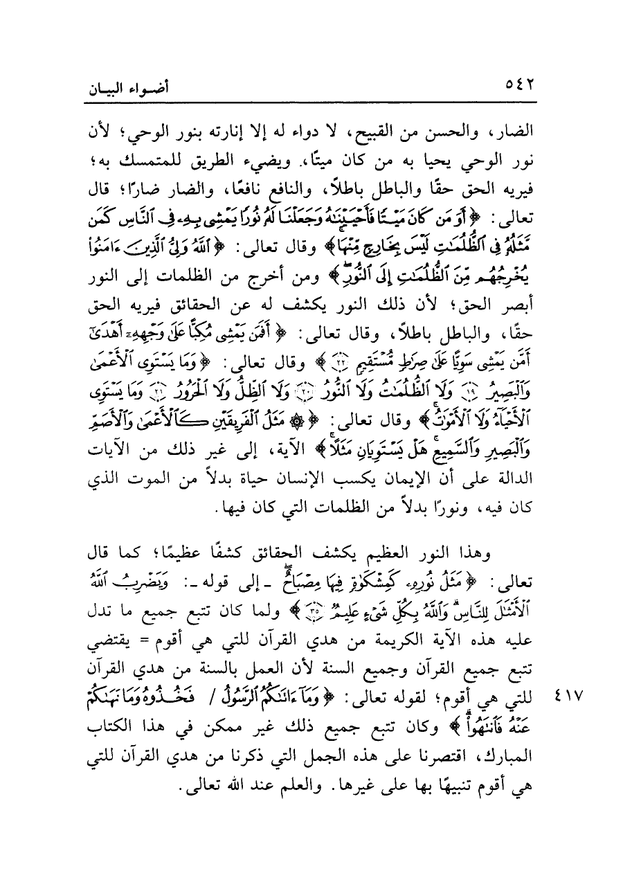 وهذا النور العظيم يكشف الحقائق كشفًا عظيمًا؛ كما قال تعالى: {مَثَلُ نُورِهِ كَمِشْكَاةٍ فِيهَا مِصْبَاحٌ} -إلى قوله-: {وَيَضْرِبُ اللَّهُ الْأَمْثَالَ لِلنَّاسِ وَاللَّهُ بِكُلِّ شَيْءٍ عَلِيمٌ (٣٥)} ولما كان تتبع جميع ما تدل عليه هذه الآية الكريمة من هدي القرآن للتي هي أقوم = يقتضي تتبع جميع القرآن وجميع السنة لأن العمل بالسنة من هدي القرآن للتي هي أقوم؛ لقوله تعالى: {وَمَا آتَاكُمُ الرَّسُولُ فَخُذُوهُ وَمَا نَهَاكُمْ عَنْهُ فَانْتَهُوا} وكان تتبع جميع ذلك غير ممكن في هذا الكتاب المبارك، اقتصرنا على هذه الجمل التي ذكرنا من هدي القرآن للتي هي أقوم تنبيهًا بها على غيرها. والعلم عند الله تعالى.
