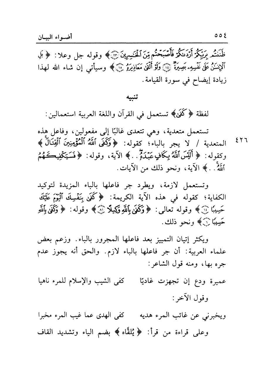 تستعمل متعدية، وهي تتعدى غالبًا إلى مفعولين، وفاعل هذه المتعدية لا يجر بالباء، كقوله: {وَكَفَى اللَّهُ الْمُؤْمِنِينَ الْقِتَالَ} وكقوله: {أَلَيْسَ اللَّهُ بِكَافٍ عَبْدَهُ .. } الآية، وقوله: {فَسَيَكْفِيكَهُمُ اللَّهُ .. } الآية، ونحو ذلك من الآيات.