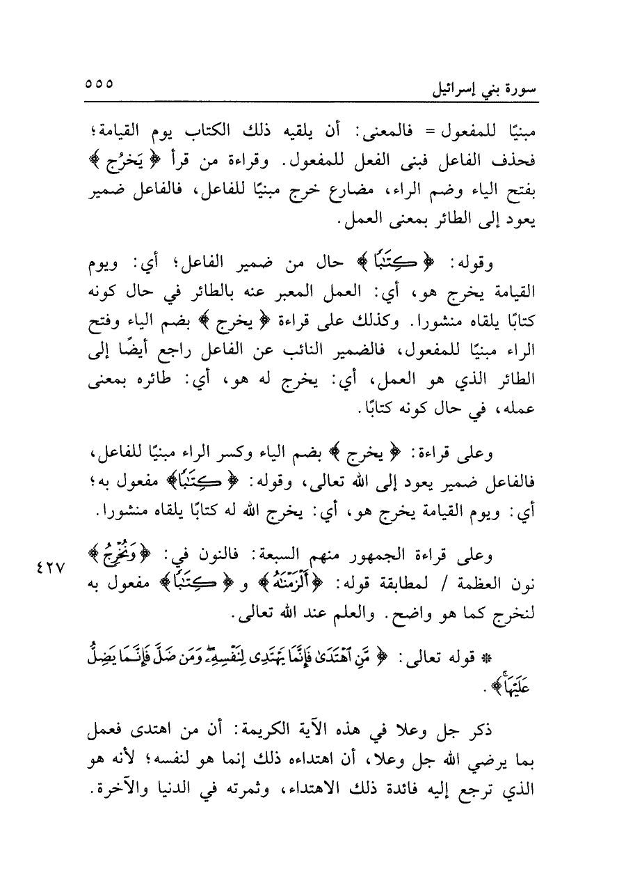 مبنيًا للمفعول = فالمعنى: أن يلقيه ذلك الكتاب يوم القيامة؛ فحذف الفاعل فبنى الفعل للمفعول. وقراءة من قرأ {يَخرُجْ} بفتح الياء وضم الراء، مضارع خرج مبنيًا للفاعل، فالفاعل ضمير يعود إلى الطائر بمعنى العمل.