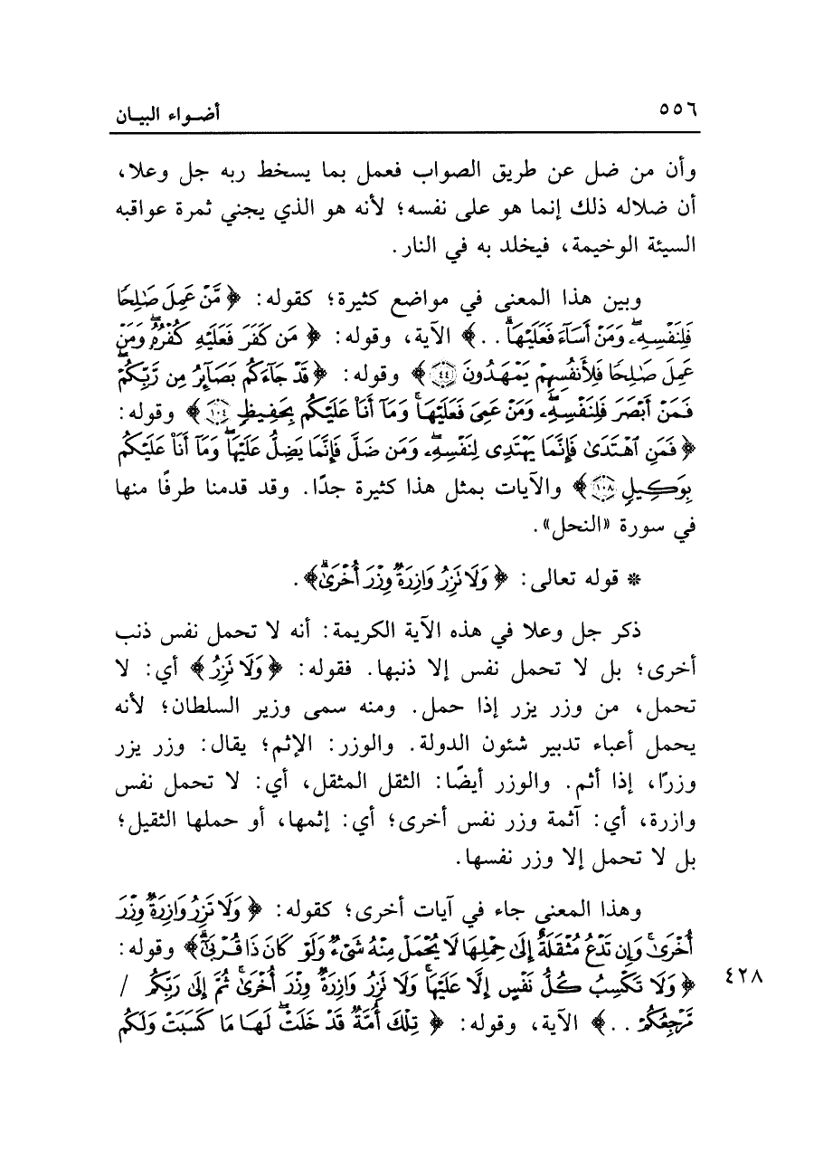 وبين هذا المعنى في مواضع كثيرة؛ كقوله: {مَنْ عَمِلَ صَالِحًا فَلِنَفْسِهِ وَمَنْ أَسَاءَ فَعَلَيْهَا .. } الآية، وقوله: {مَنْ كَفَرَ فَعَلَيْهِ كُفْرُهُ وَمَنْ عَمِلَ صَالِحًا فَلِأَنْفُسِهِمْ يَمْهَدُونَ (٤٤)} وقوله: {قَدْ جَاءَكُمْ بَصَائِرُ مِنْ رَبِّكُمْ فَمَنْ أَبْصَرَ فَلِنَفْسِهِ وَمَنْ عَمِيَ فَعَلَيْهَا وَمَا أَنَا عَلَيْكُمْ بِحَفِيظٍ (١٠٤)} وقوله: {فَمَنِ اهْتَدَى فَإِنَّمَا يَهْتَدِي لِنَفْسِهِ وَمَنْ ضَلَّ فَإِنَّمَا يَضِلُّ عَلَيْهَا وَمَا أَنَا عَلَيْكُمْ بِوَكِيلٍ (١٠٨)} والآيات بمثل هذا كثيرة جدًا. وقد قدمنا طرفًا منها في سورة "النحل".