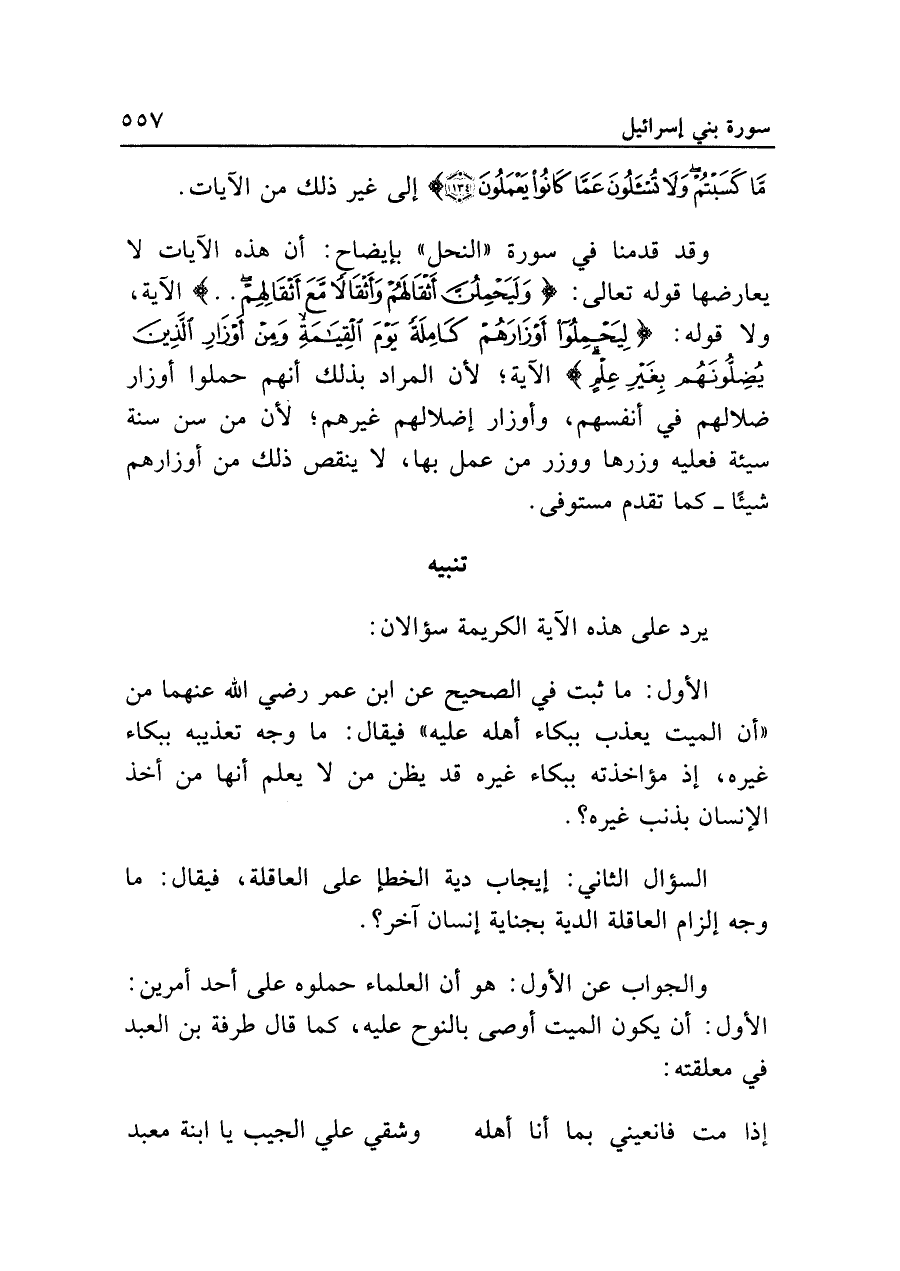 الأول: ما ثبت في الصحيح عن ابن عمر رضي الله عنهما من "أن الميت يعذب ببكاء أهله عليه" فيقال: ما وجه تعذيبه ببكاء غيره، إذ مؤاخذته ببكاء غيره قد يظن من لا يعلم أنها من أخذ الإنسان بذنب غيره؟.