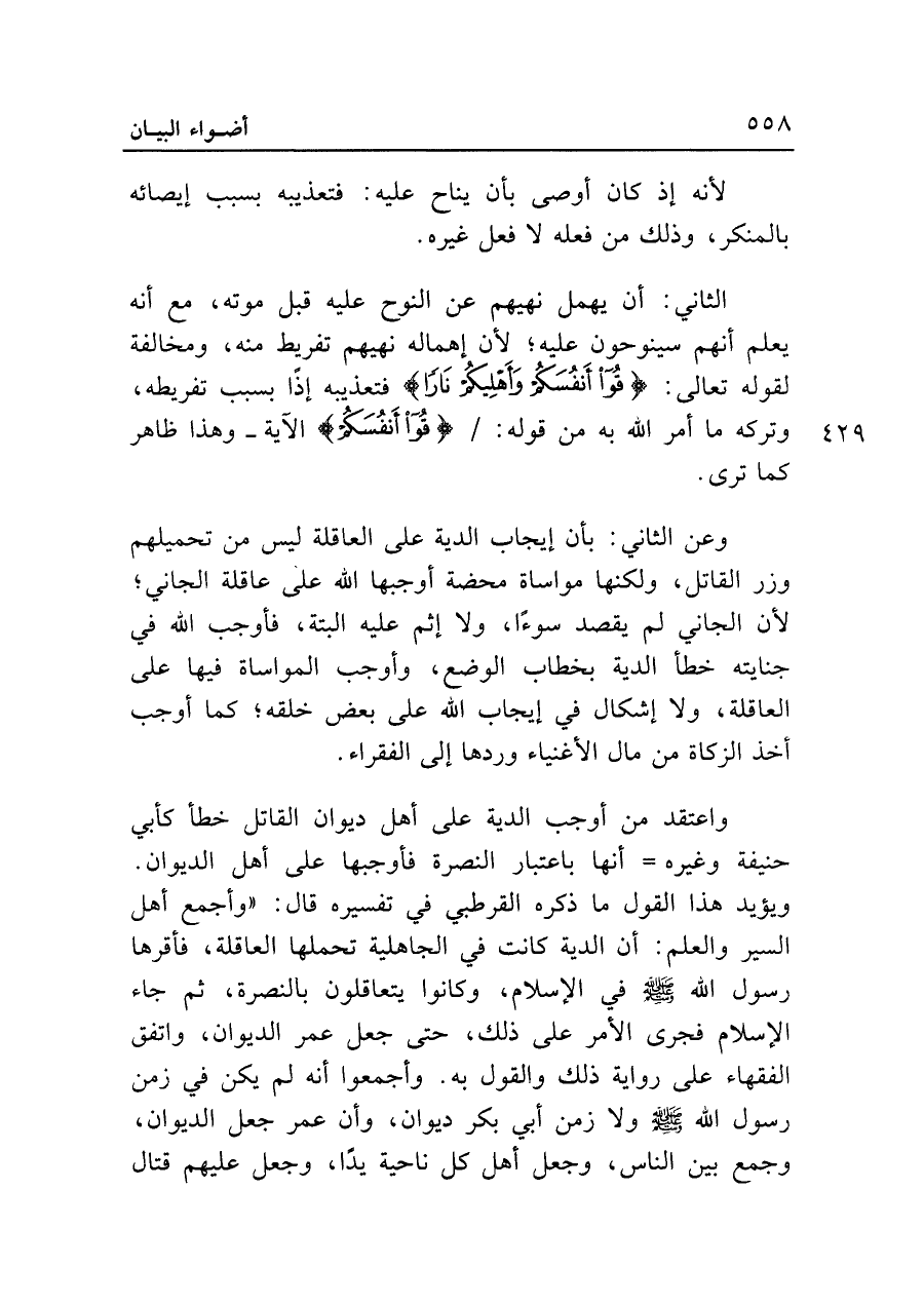 الثاني: أن يهمل نهيهم عن النوح عليه قبل موته، مع أنه يعلم أنهم سينوحون عليه؛ لأن إهماله نهيهم تفريط منه، ومخالفة لقوله تعالى: {قُوا أَنْفُسَكُمْ وَأَهْلِيكُمْ نَارًا} فتعذيبه إذًا بسبب تفريطه، وتركه ما أمر الله به من قوله: {قُوا أَنْفُسَكُمْ} الآية - وهذا ظاهر كما ترى.