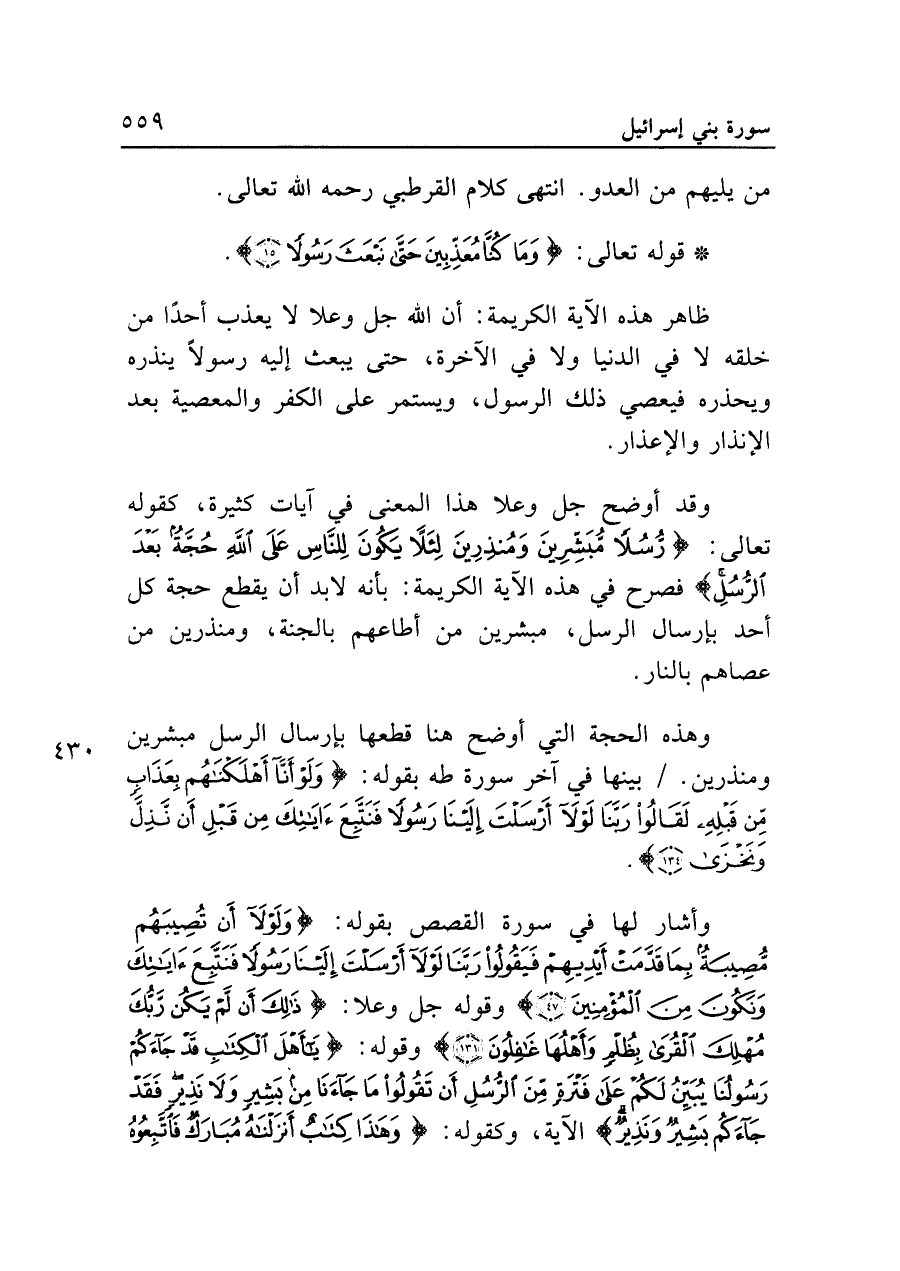 وأشار لها في سورة القصص بقوله: {وَلَوْلَا أَنْ تُصِيبَهُمْ مُصِيبَةٌ بِمَا قَدَّمَتْ أَيْدِيهِمْ فَيَقُولُوا رَبَّنَا لَوْلَا أَرْسَلْتَ إِلَيْنَا رَسُولًا فَنَتَّبِعَ آيَاتِكَ وَنَكُونَ مِنَ الْمُؤْمِنِينَ (٤٧)} وقوله جل وعلا: {ذَلِكَ أَنْ لَمْ يَكُنْ رَبُّكَ مُهْلِكَ الْقُرَى بِظُلْمٍ وَأَهْلُهَا غَافِلُونَ (١٣١)} وقوله: {يَاأَهْلَ الْكِتَابِ قَدْ جَاءَكُمْ رَسُولُنَا يُبَيِّنُ لَكُمْ عَلَى فَتْرَةٍ مِنَ الرُّسُلِ أَنْ تَقُولُوا مَا جَاءَنَا مِنْ بَشِيرٍ وَلَا نَذِيرٍ فَقَدْ جَاءَكُمْ بَشِيرٌ وَنَذِيرٌ} الآية، وكقوله: {وَهَذَا كِتَابٌ أَنْزَلْنَاهُ مُبَارَكٌ فَاتَّبِعُوهُ